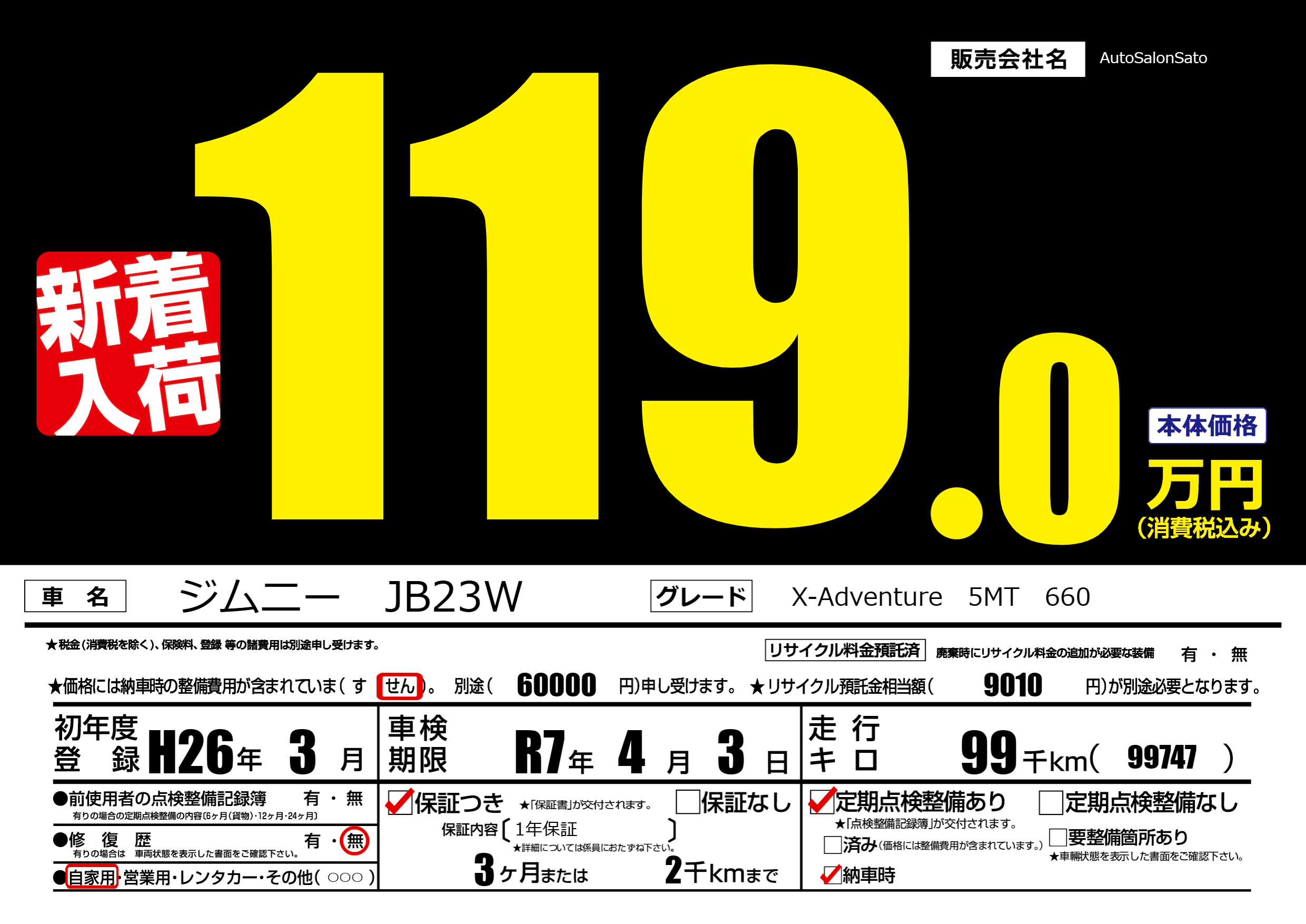 | 車名 | ジムニー JB23W | グレード ミッション 排気量 |