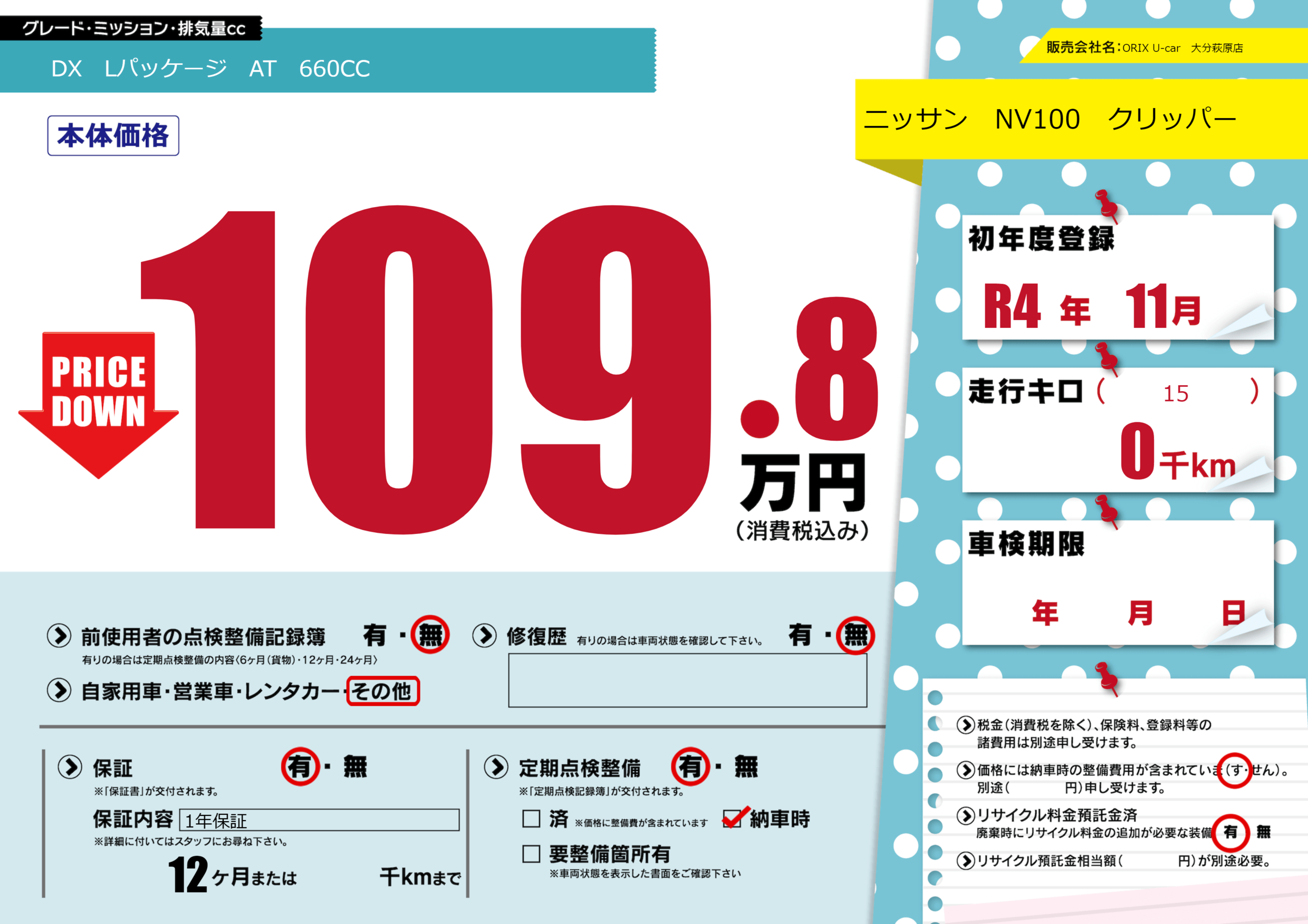 | 定期点検整備 | 定期点検整備あり 納車時あり | ||