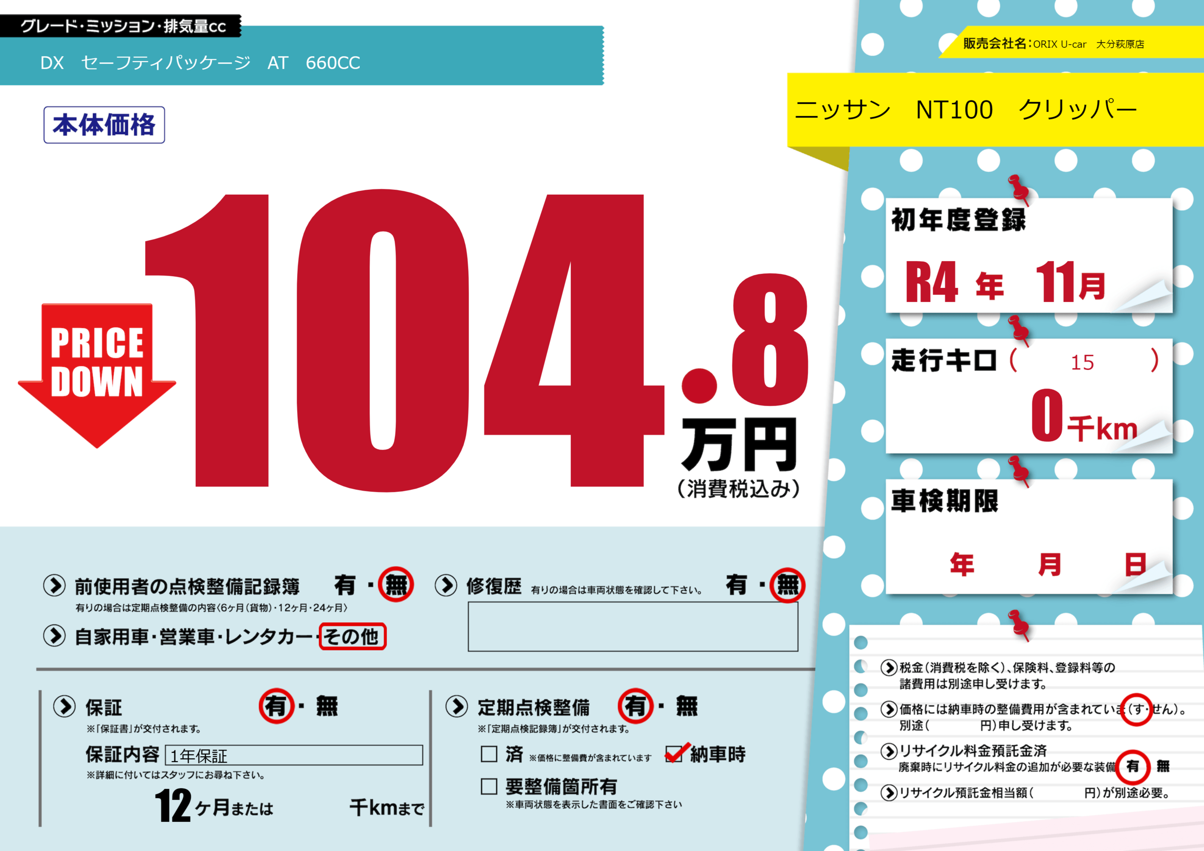| 車名 | ニッサン NT100 クリッパー | グレード ミッション 排気量 |