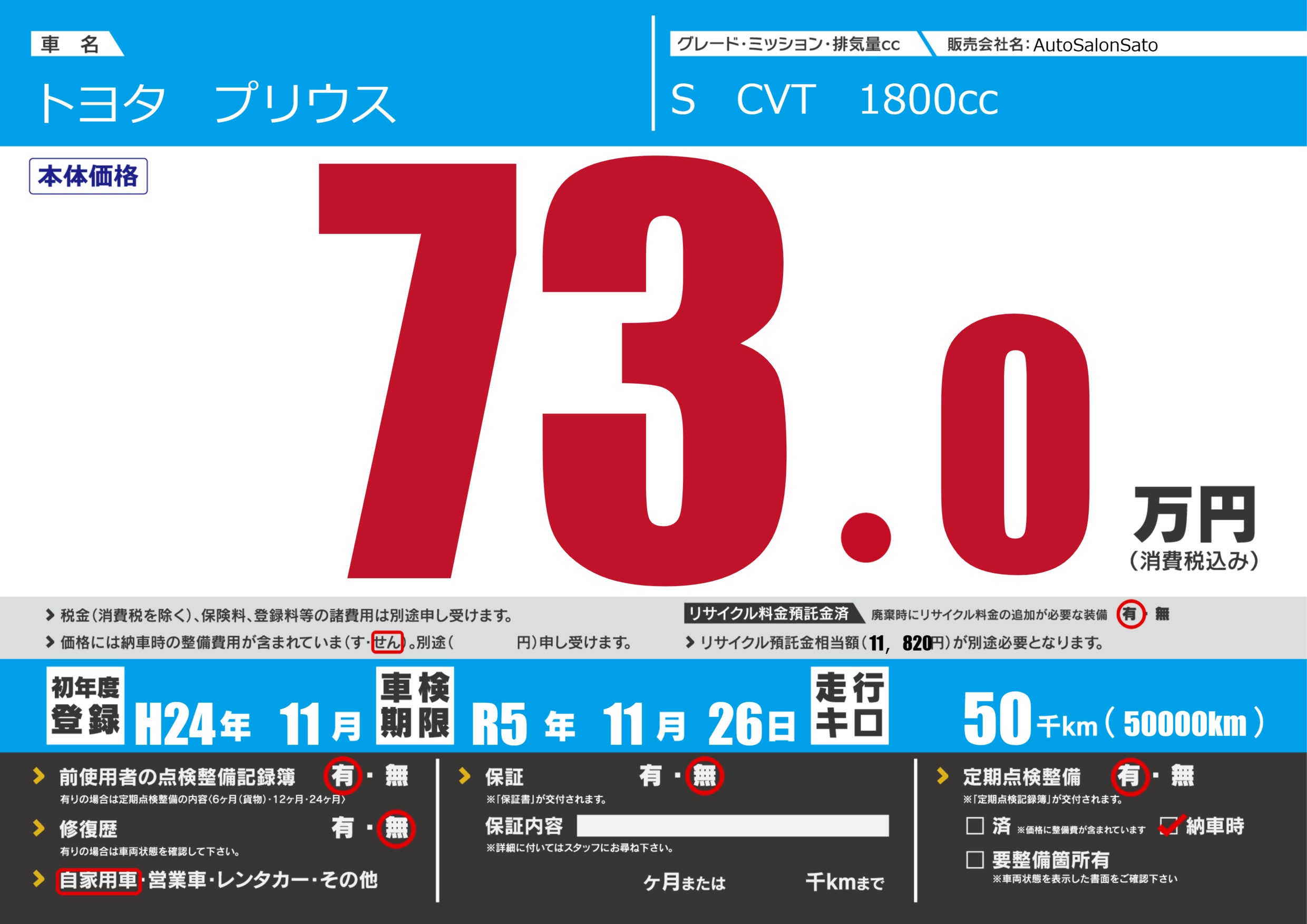 | 車名 | トヨタ プリウス | グレード ミッション 排気量 |
