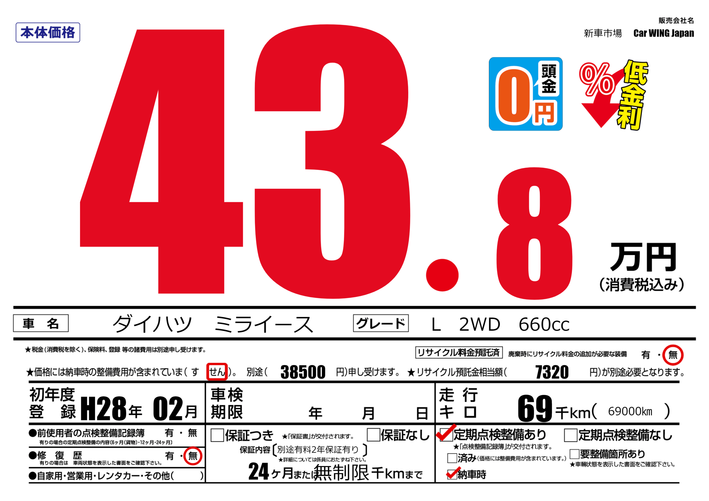 | 車名 | ダイハツ ミライース | グレード ミッション 排気量 |