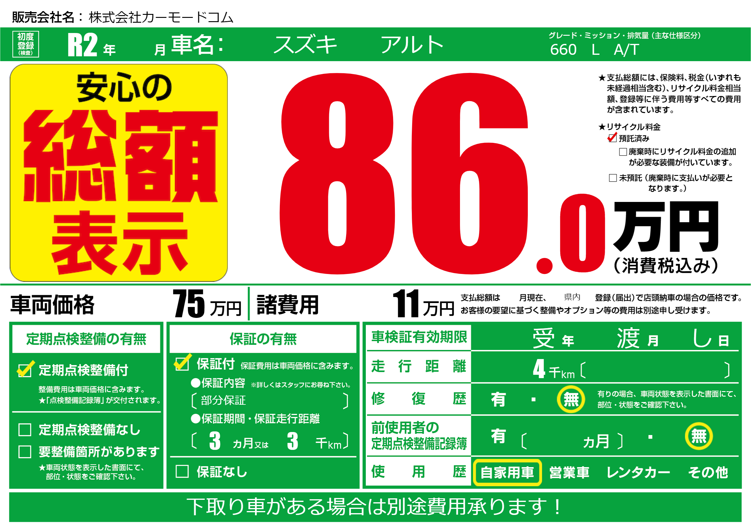 | 車名 | スズキ アルト | グレード ミッション 排気量 |