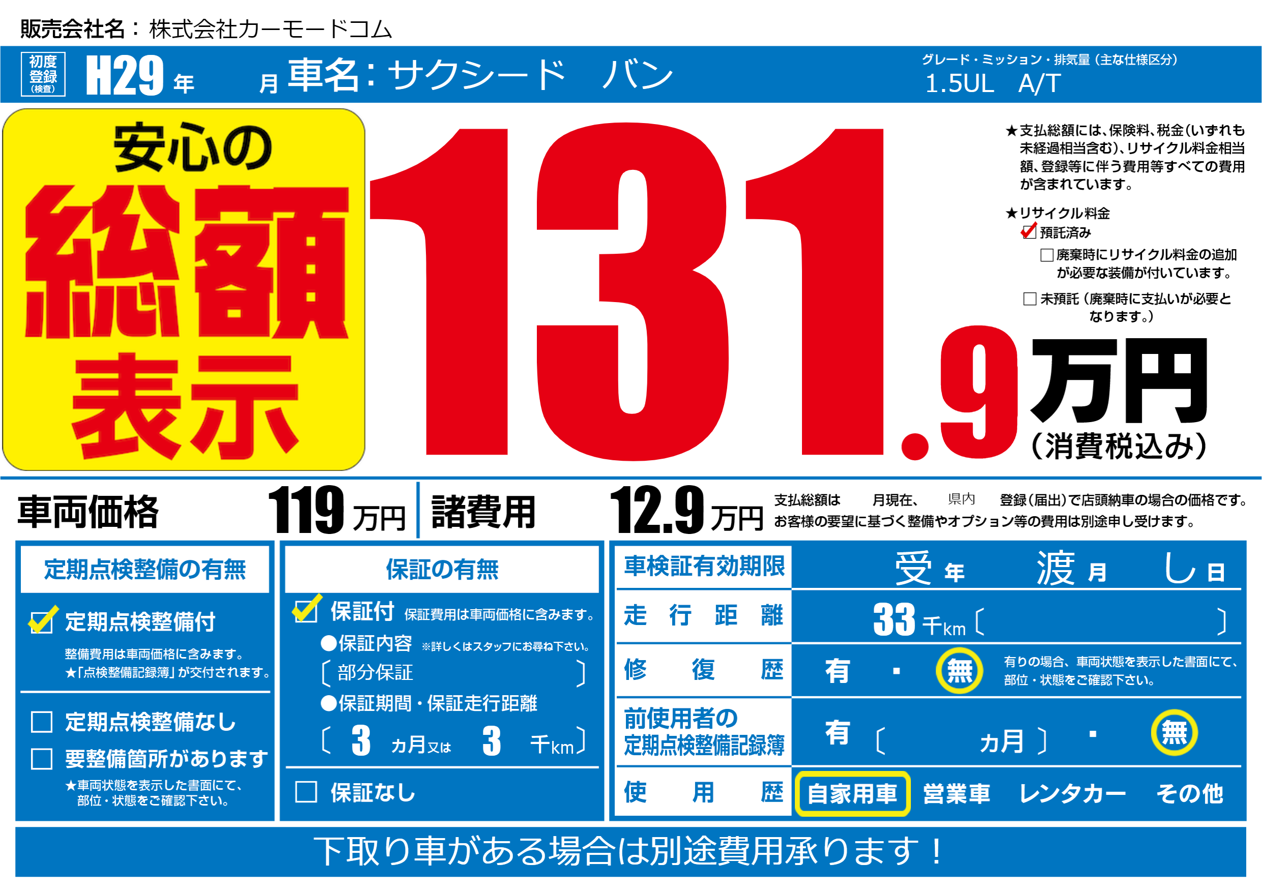 | 車名 | サクシード バン | グレード ミッション 排気量 |
