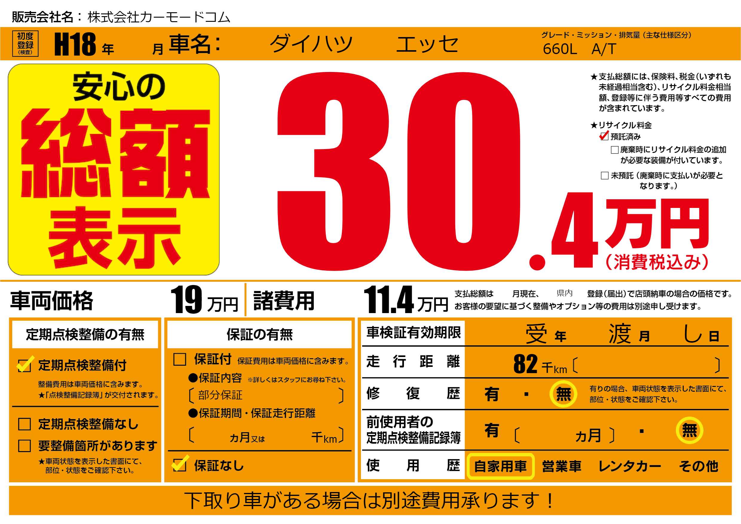 | 車名 | ダイハツ エッセ | グレード ミッション 排気量 |