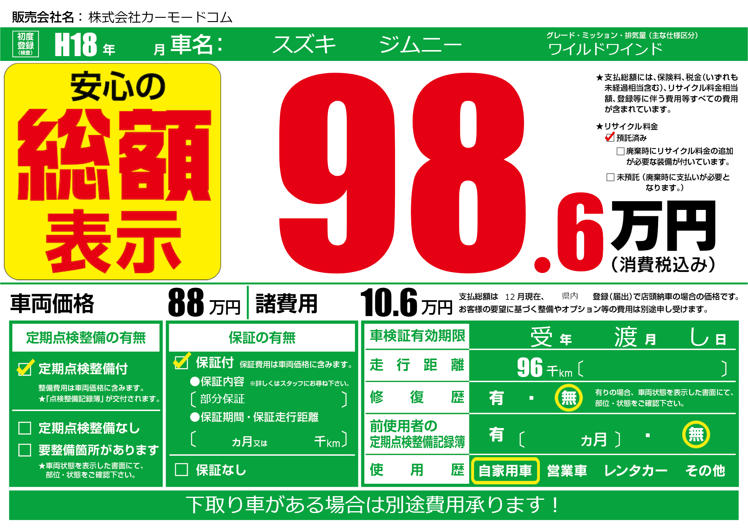 保証付き 保証内容(部分保証) ---ヶ月または()千kmまで |