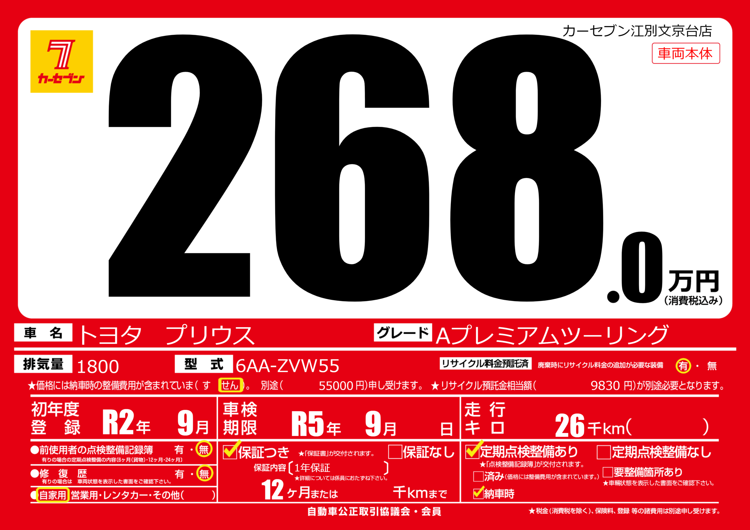 | 車名 | トヨタ プリウス | グレード ミッション 排気量 |