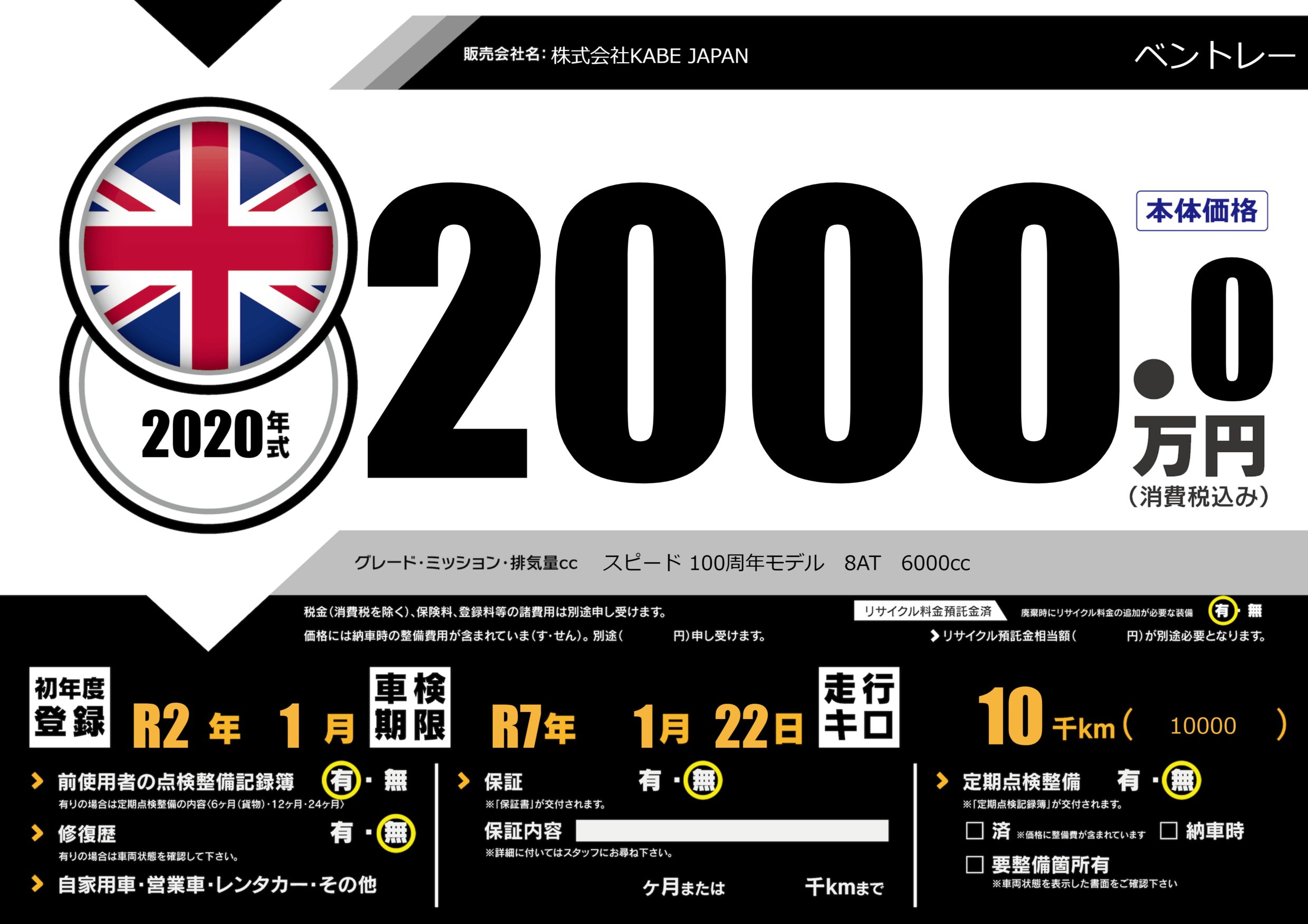 | 車名 | ベントレー | グレード ミッション 排気量 |