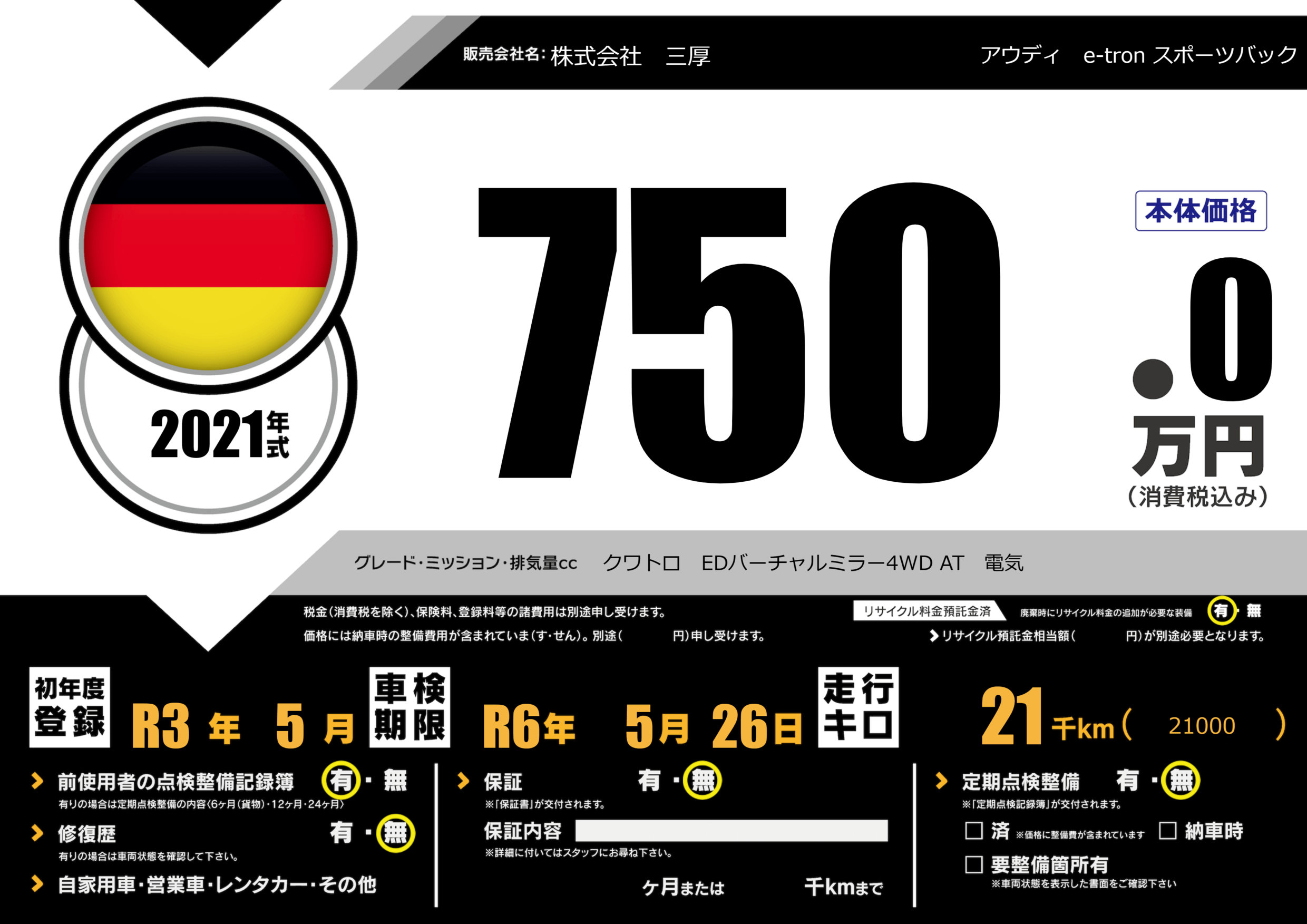 | 車名 | アウディ e-tron スポーツバック | グレード ミッション 排気量 |