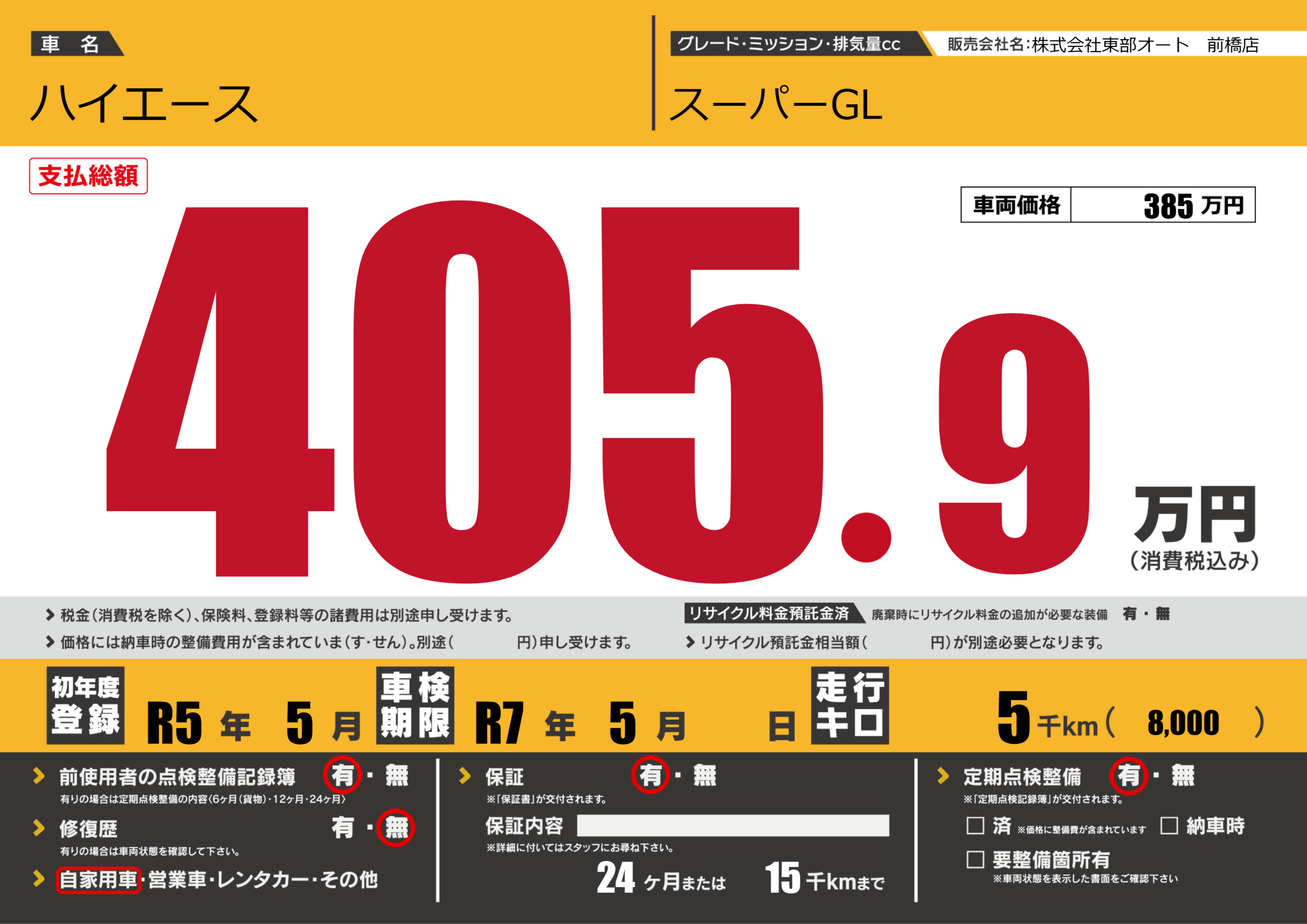 | 車名 | ハイエース | グレード ミッション 排気量 |