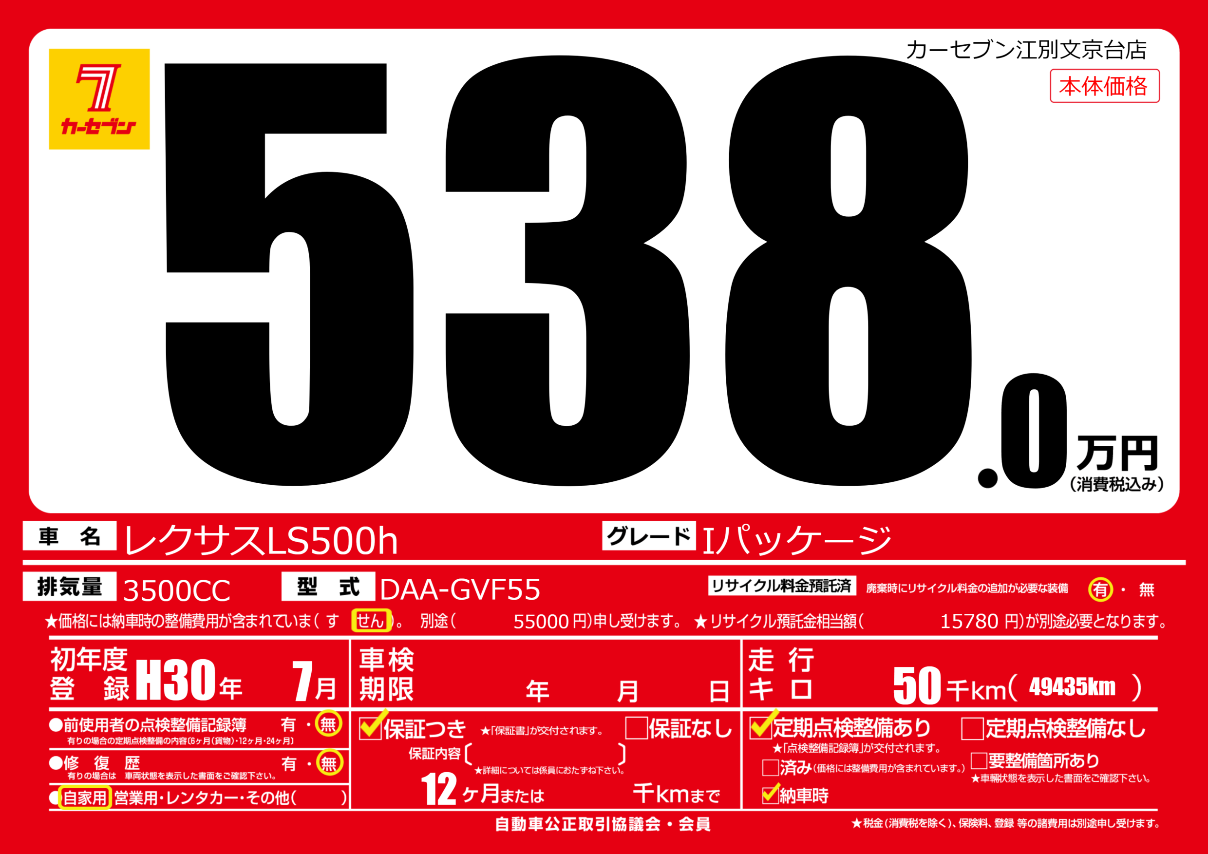 | 車名 | レクサスLS500h | グレード ミッション 排気量 |