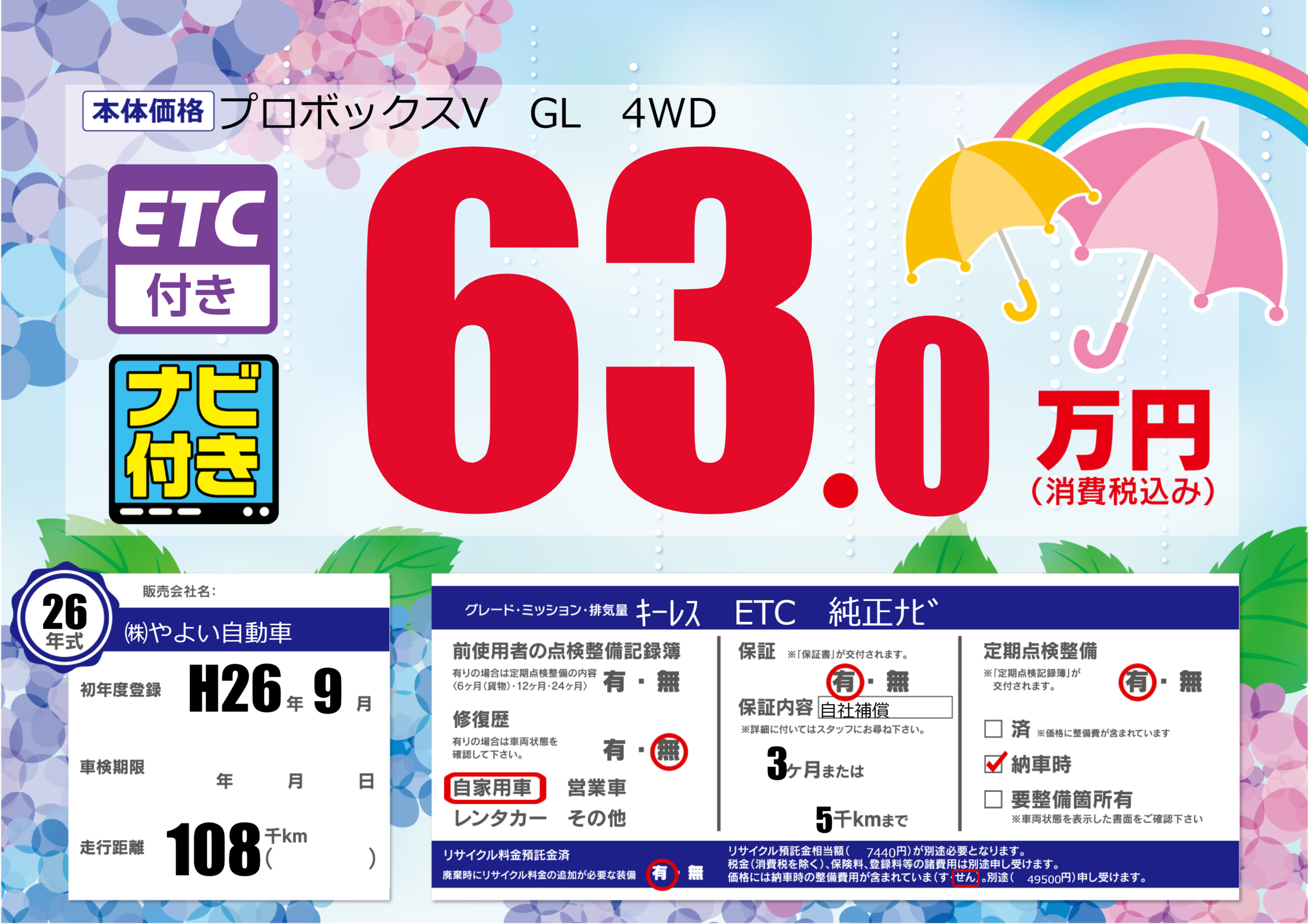 | 車名 | プロボックスV GL 4WD | グレード ミッション 排気量 |