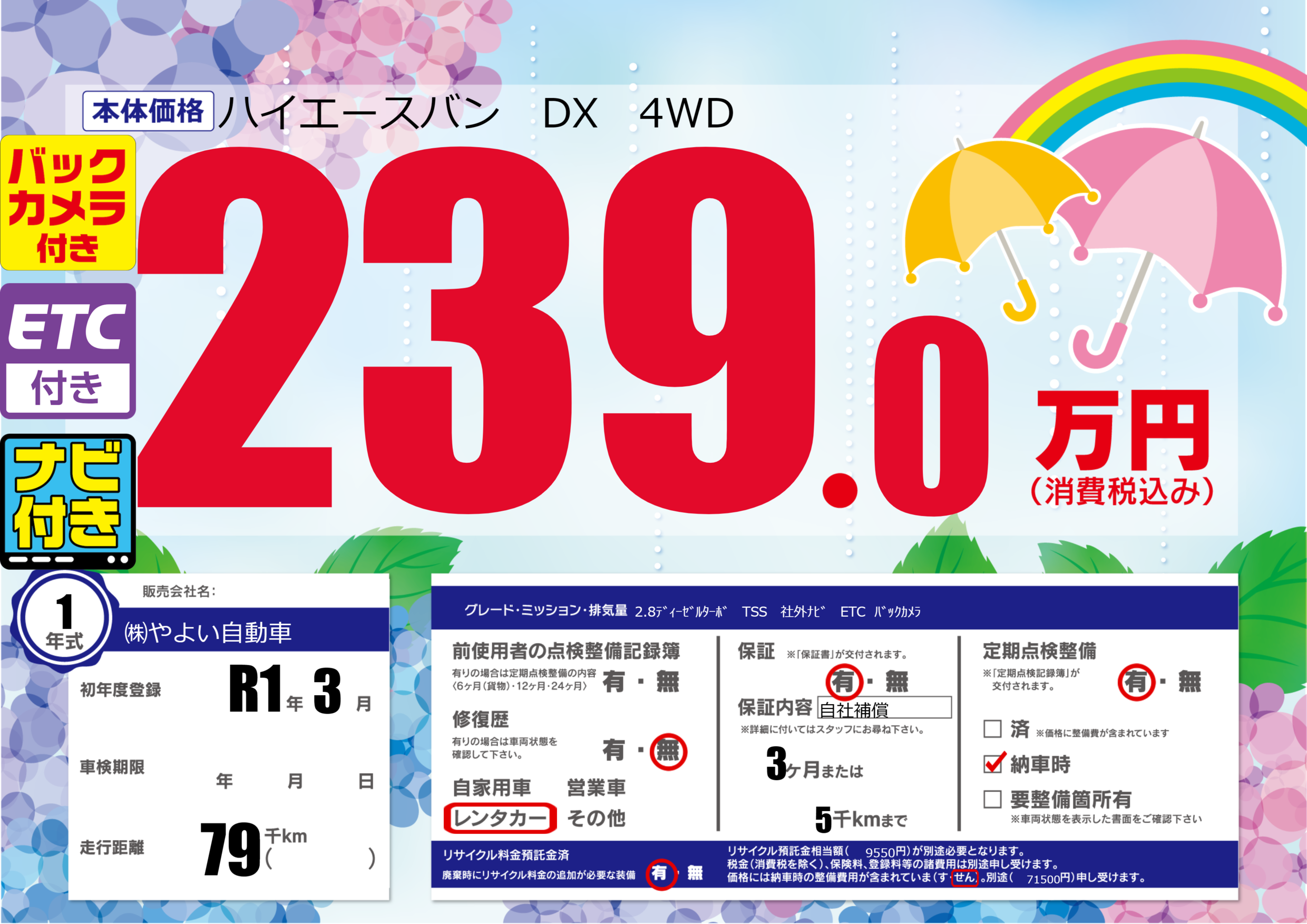 | 車名 | ハイエースバン DX 4WD | グレード ミッション 排気量 |