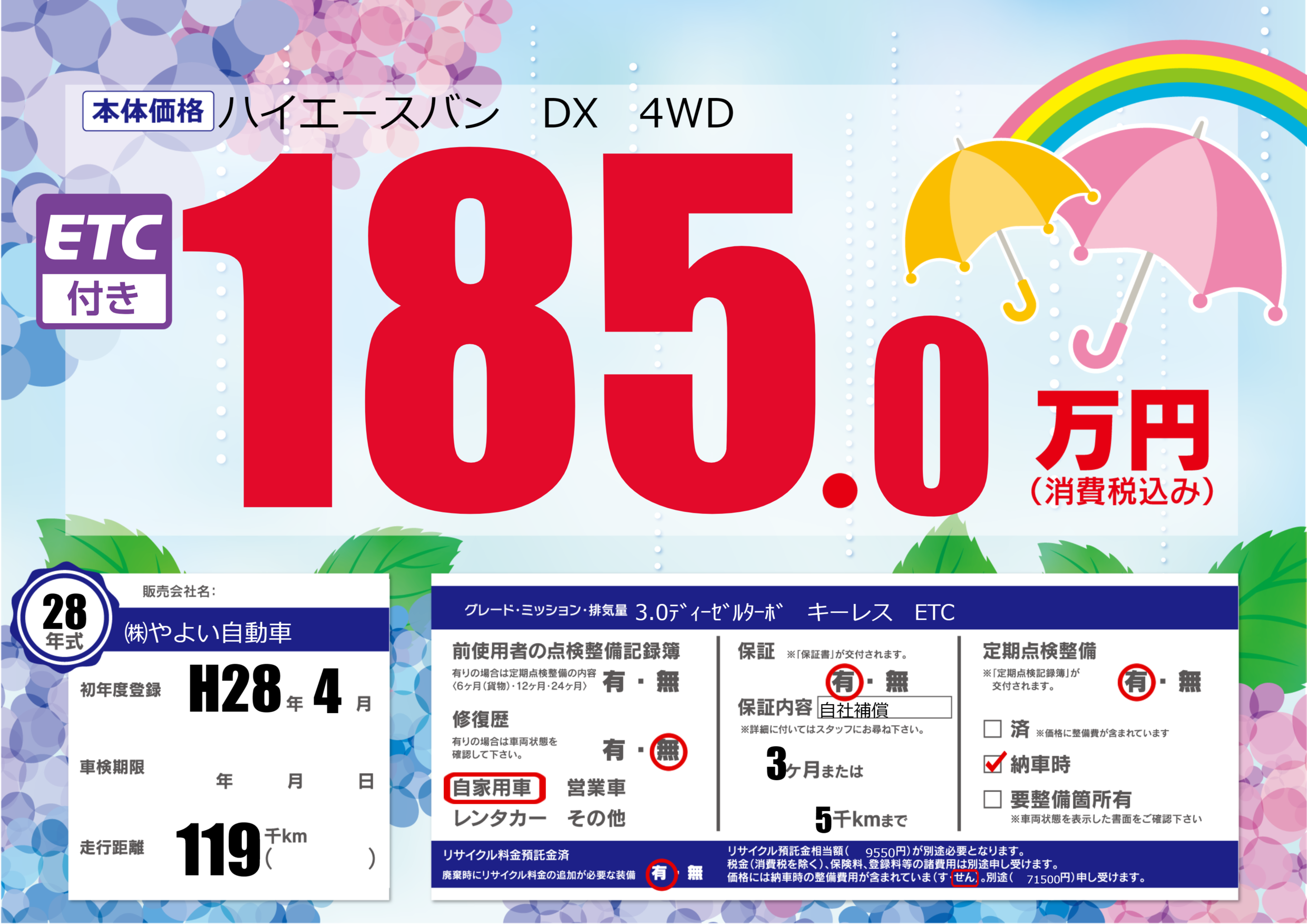 | 車名 | ハイエースバン DX 4WD | グレード ミッション 排気量 |