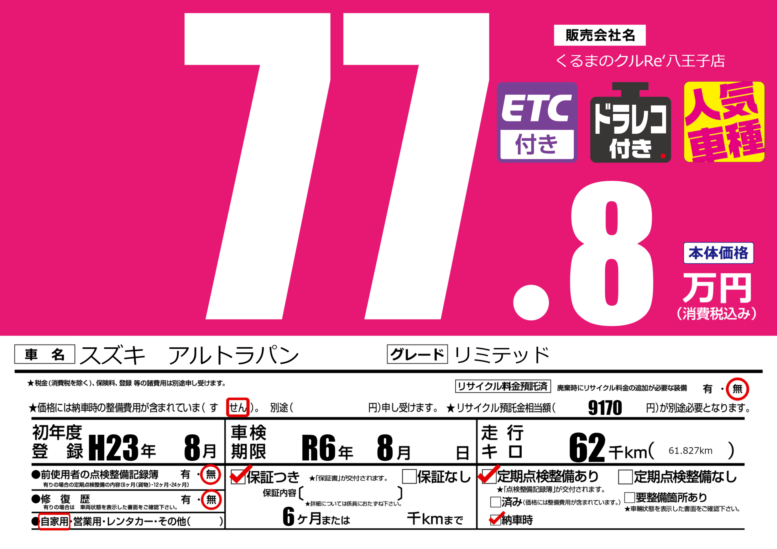 | 走行キロ | 6.2万km | 初年度登録 | H23年8月 |