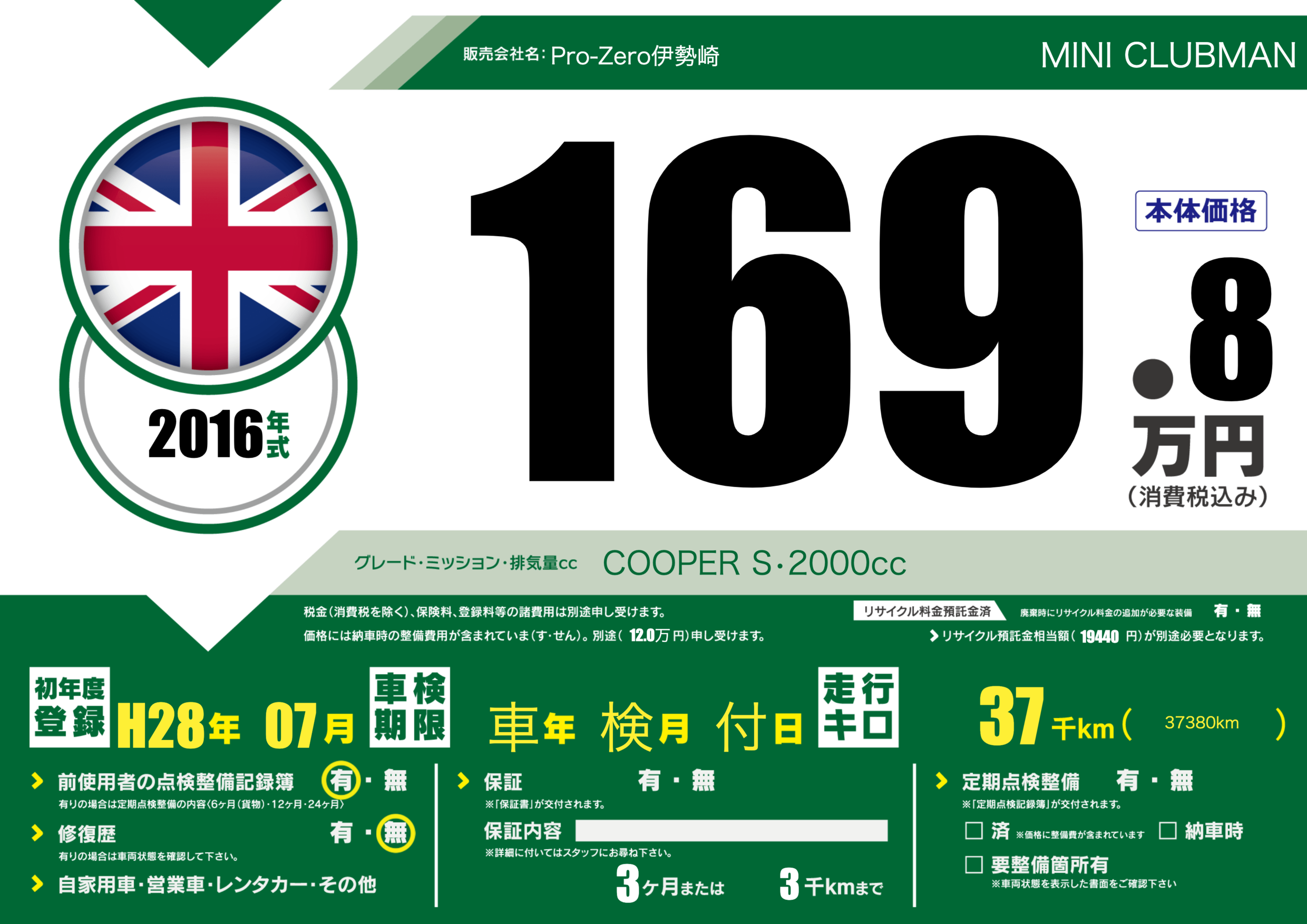 | 車名 | MINI CLUBMAN | グレード ミッション 排気量 |