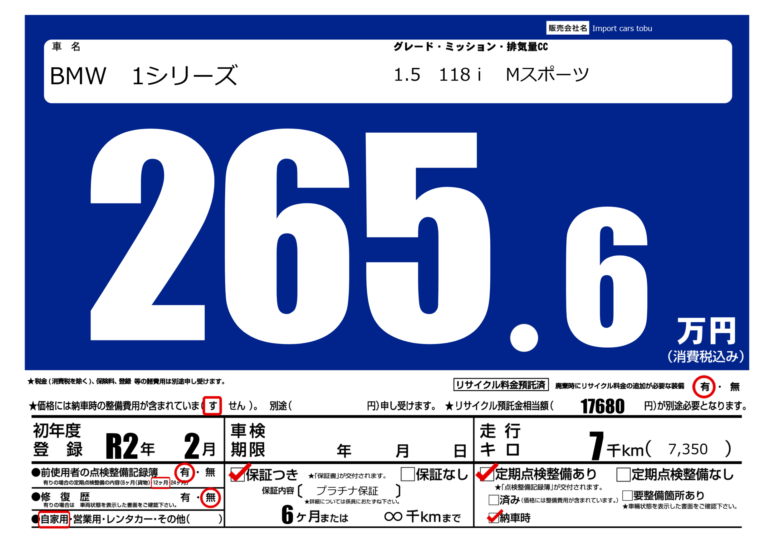 保証付き 保証内容( プラチナ保証) 6ヶ月または(∞)千kmまで |