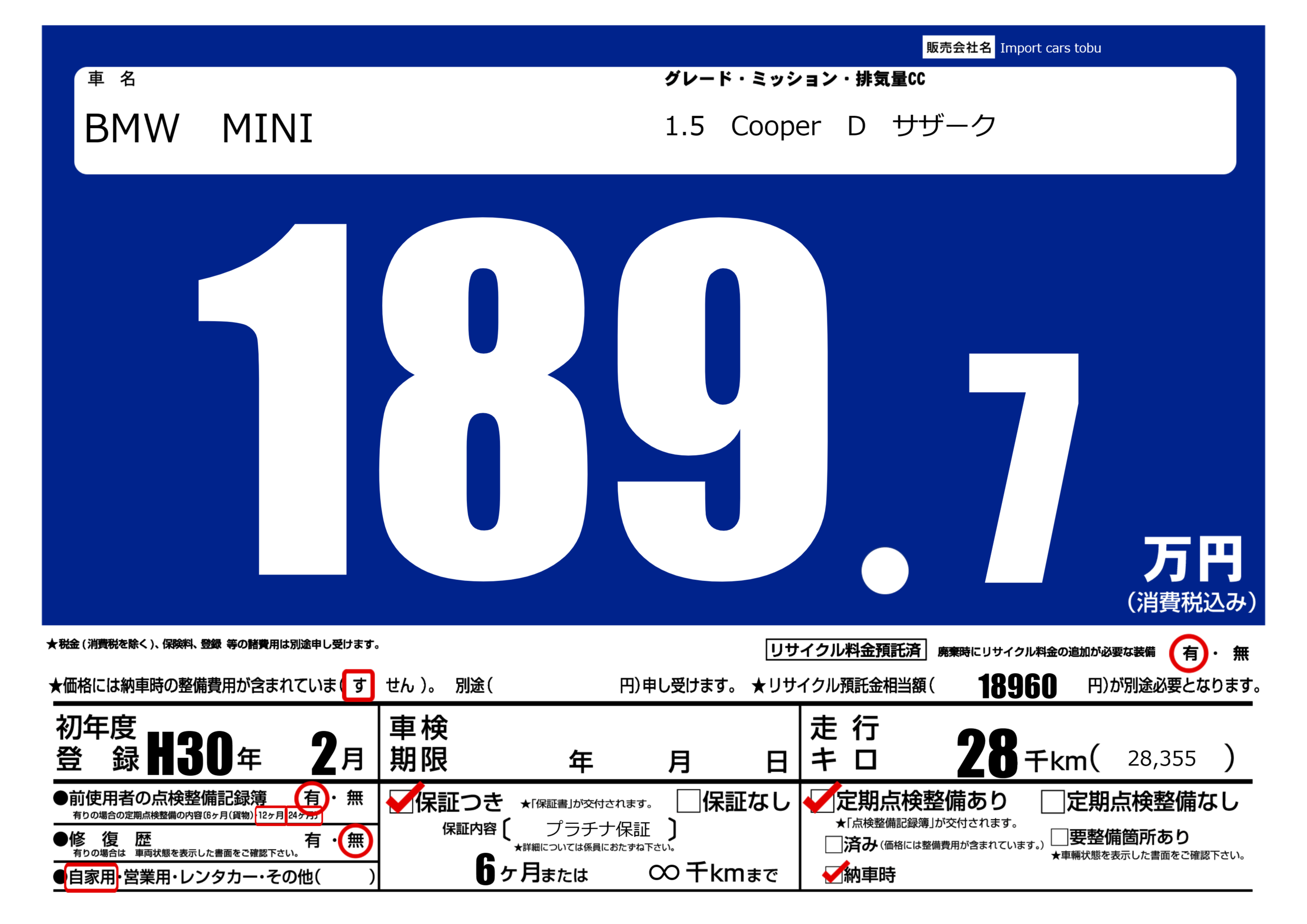 保証付き 保証内容( プラチナ保証) 6ヶ月または(∞)千kmまで |