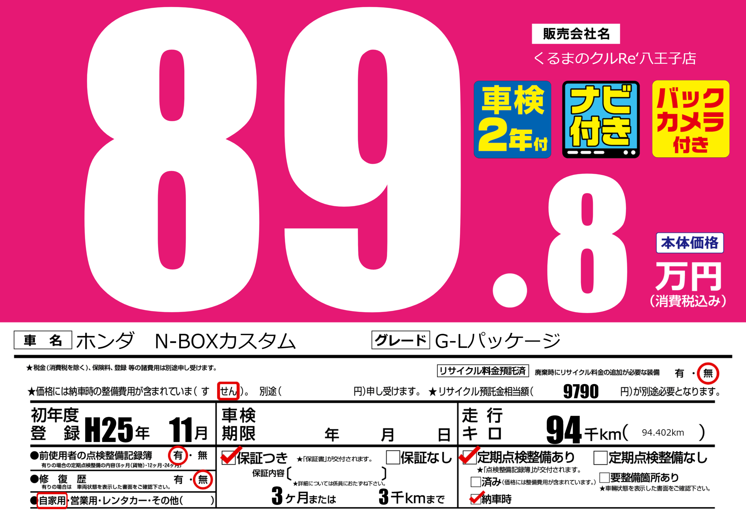 | 車名 | ホンダ N-BOXカスタム | グレード ミッション 排気量 |