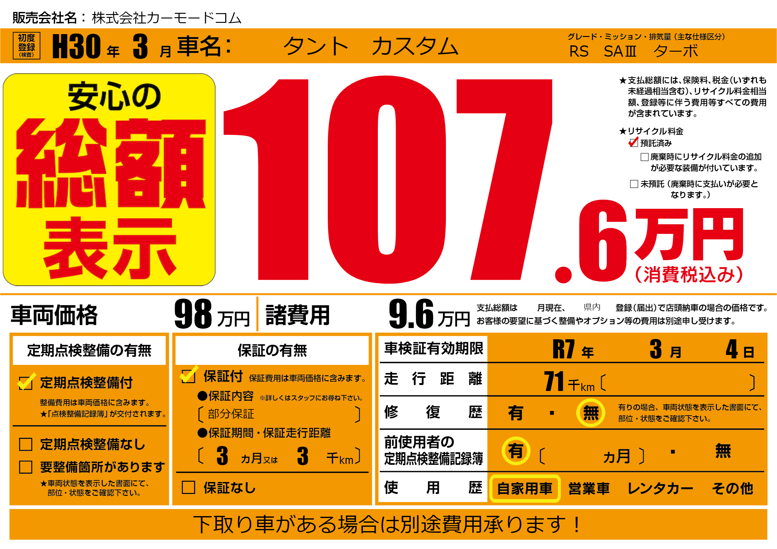 保証付き 保証内容(部分保証) 3ヶ月または(3)千kmまで |