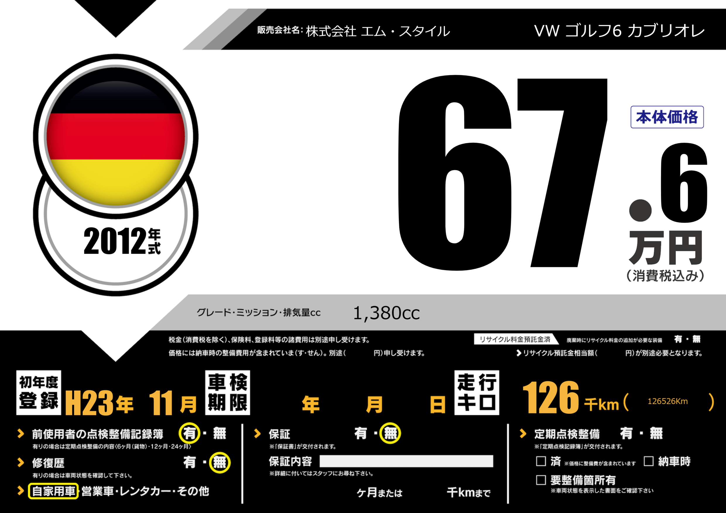 | 車名 | VW ゴルフ6 カブリオレ | グレード ミッション 排気量 |