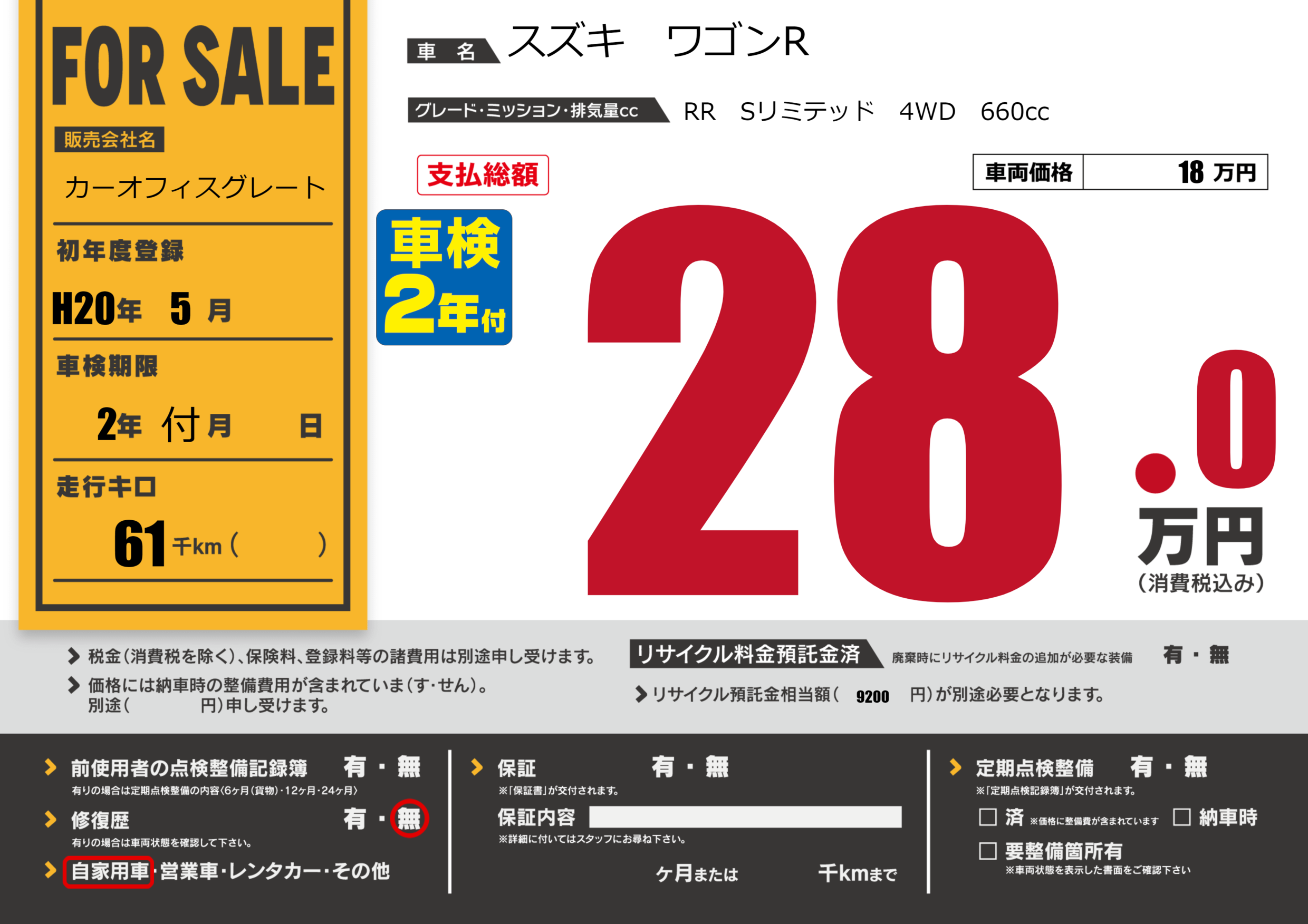 | 走行キロ | 6.1万km | 初年度登録 | H20年5月 |