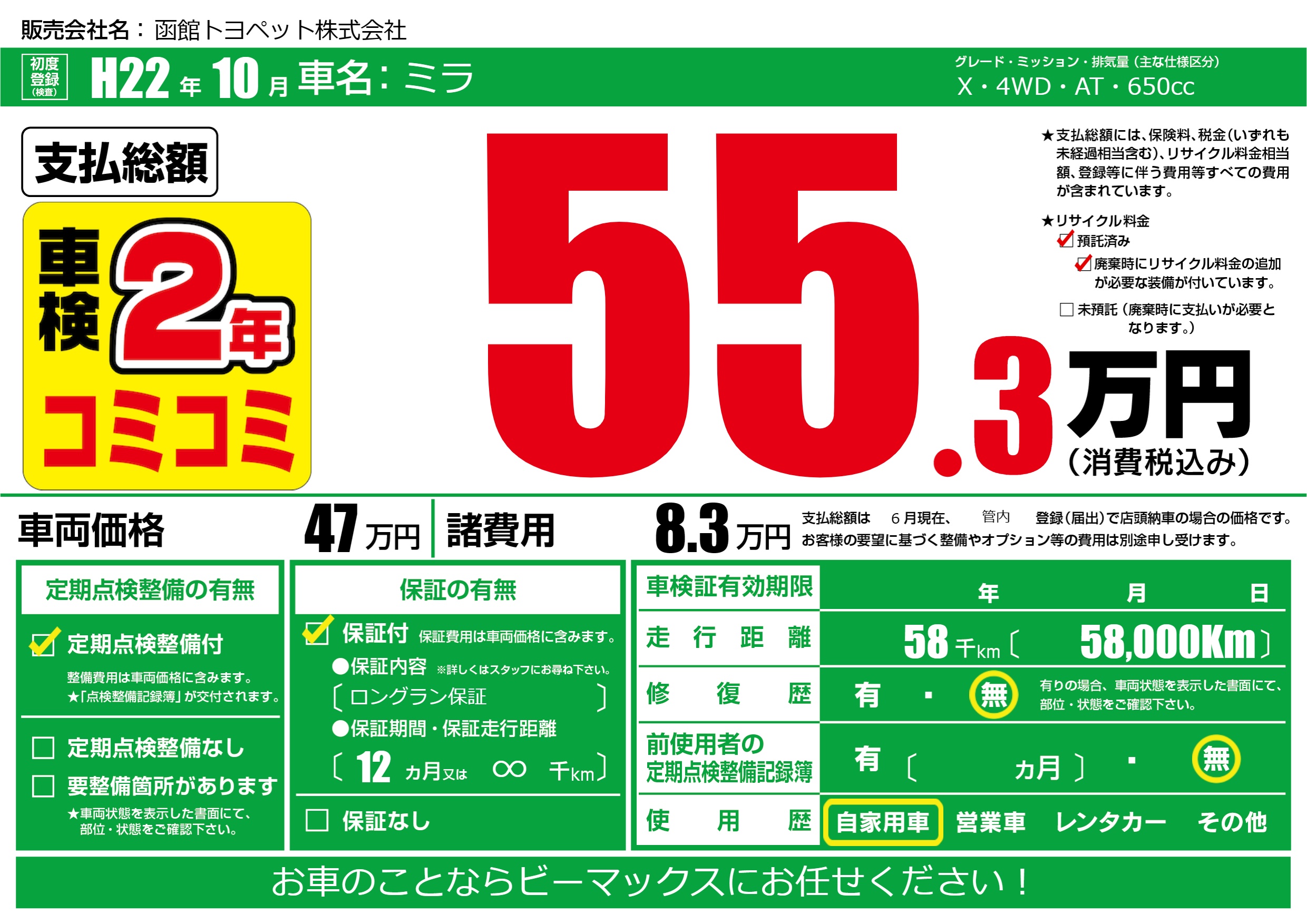 | 走行キロ | 5.8万km | 初年度登録 | H22年10月 |