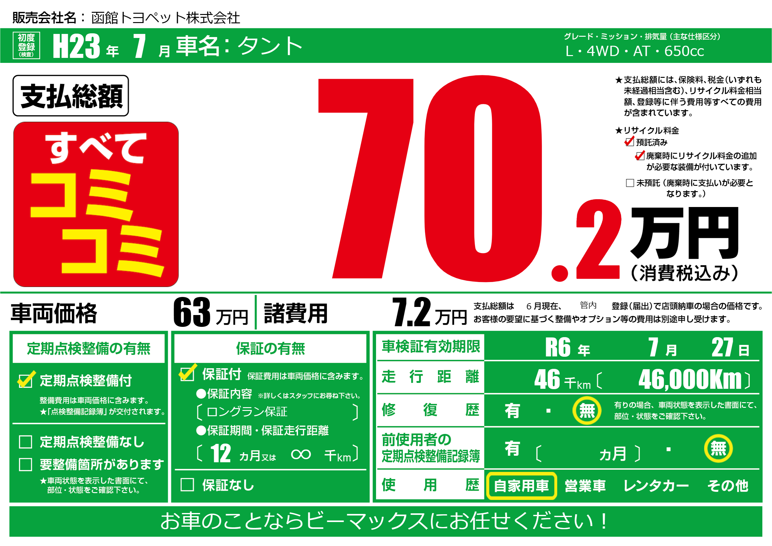 | 走行キロ | 4.6万km | 初年度登録 | H23年7月 |