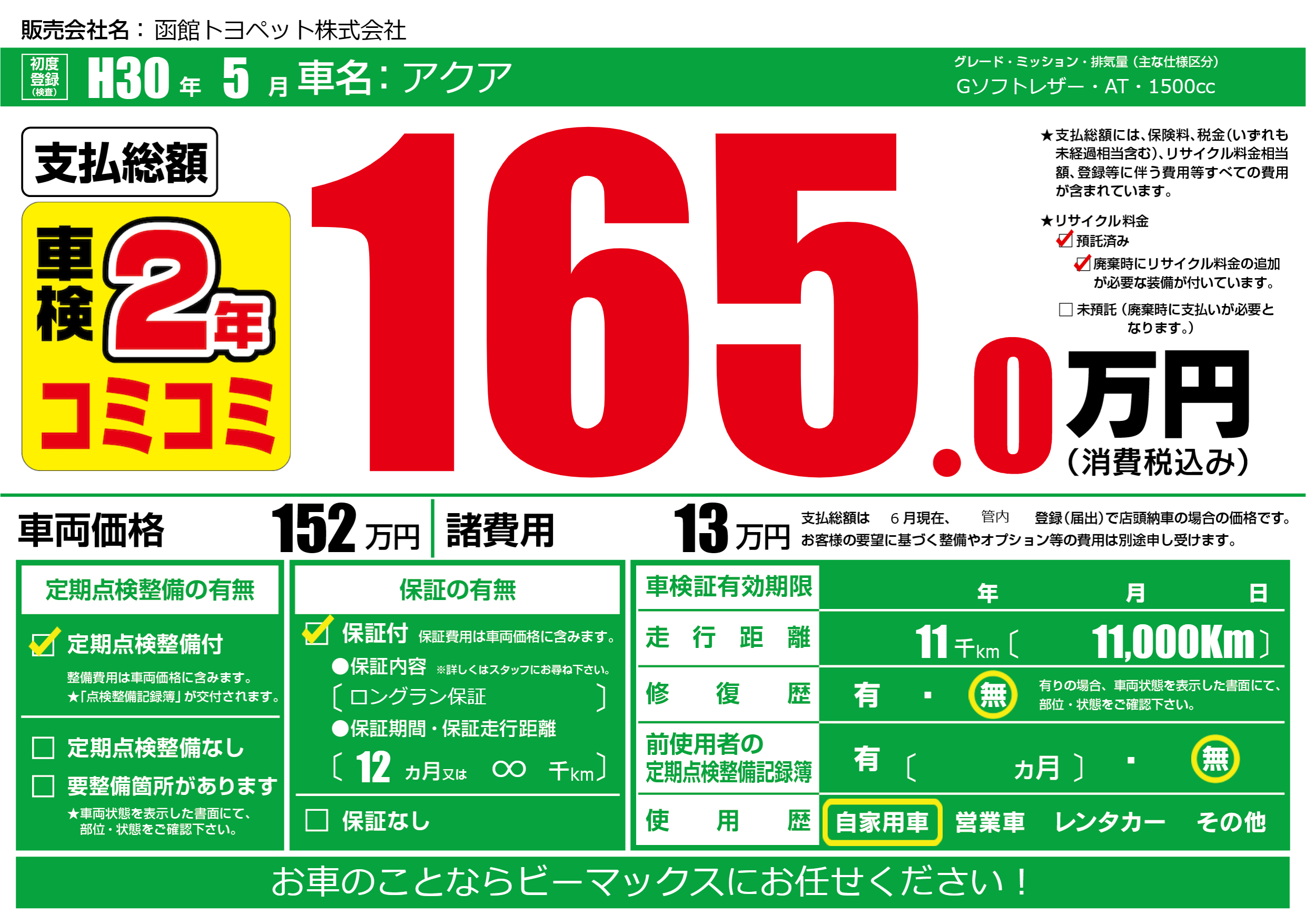 | 走行キロ | 1.1万km | 初年度登録 | H30年5月 |