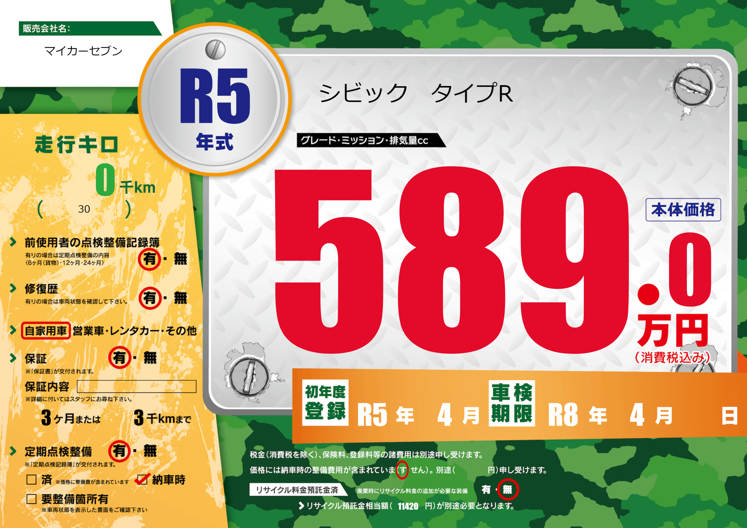 | 車名 | シビック タイプR | グレード ミッション 排気量 |