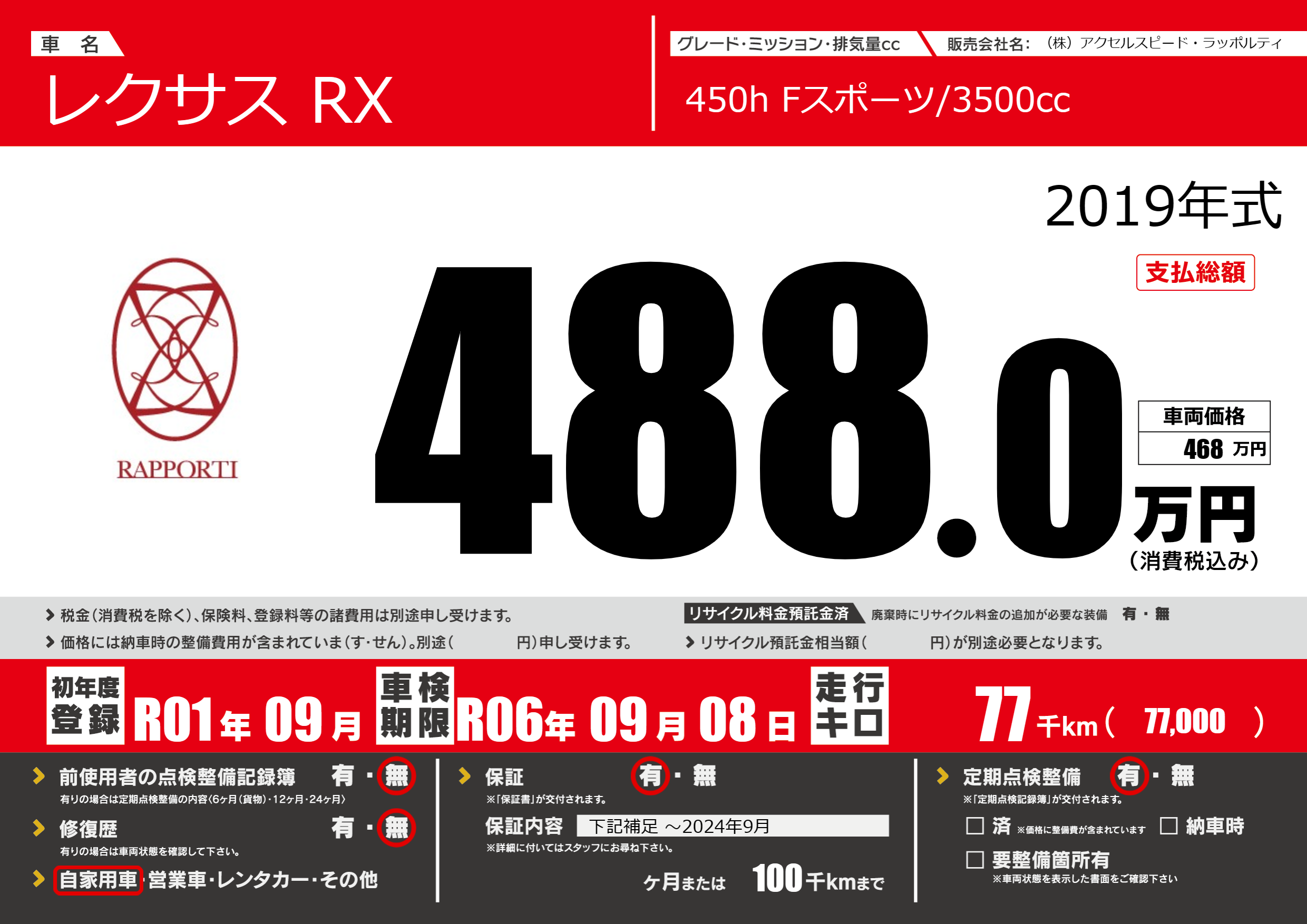 | 車名 | レクサス RX | グレード ミッション 排気量 |