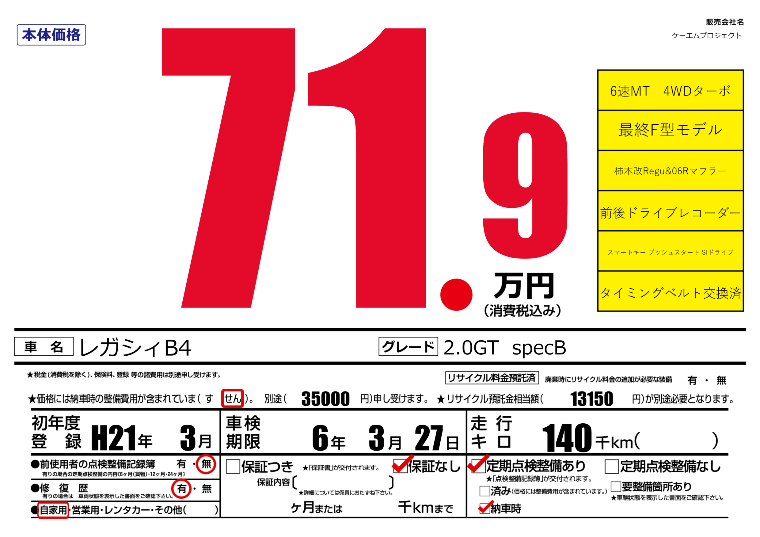 | 車名 | レガシィB4 | グレード ミッション 排気量 |