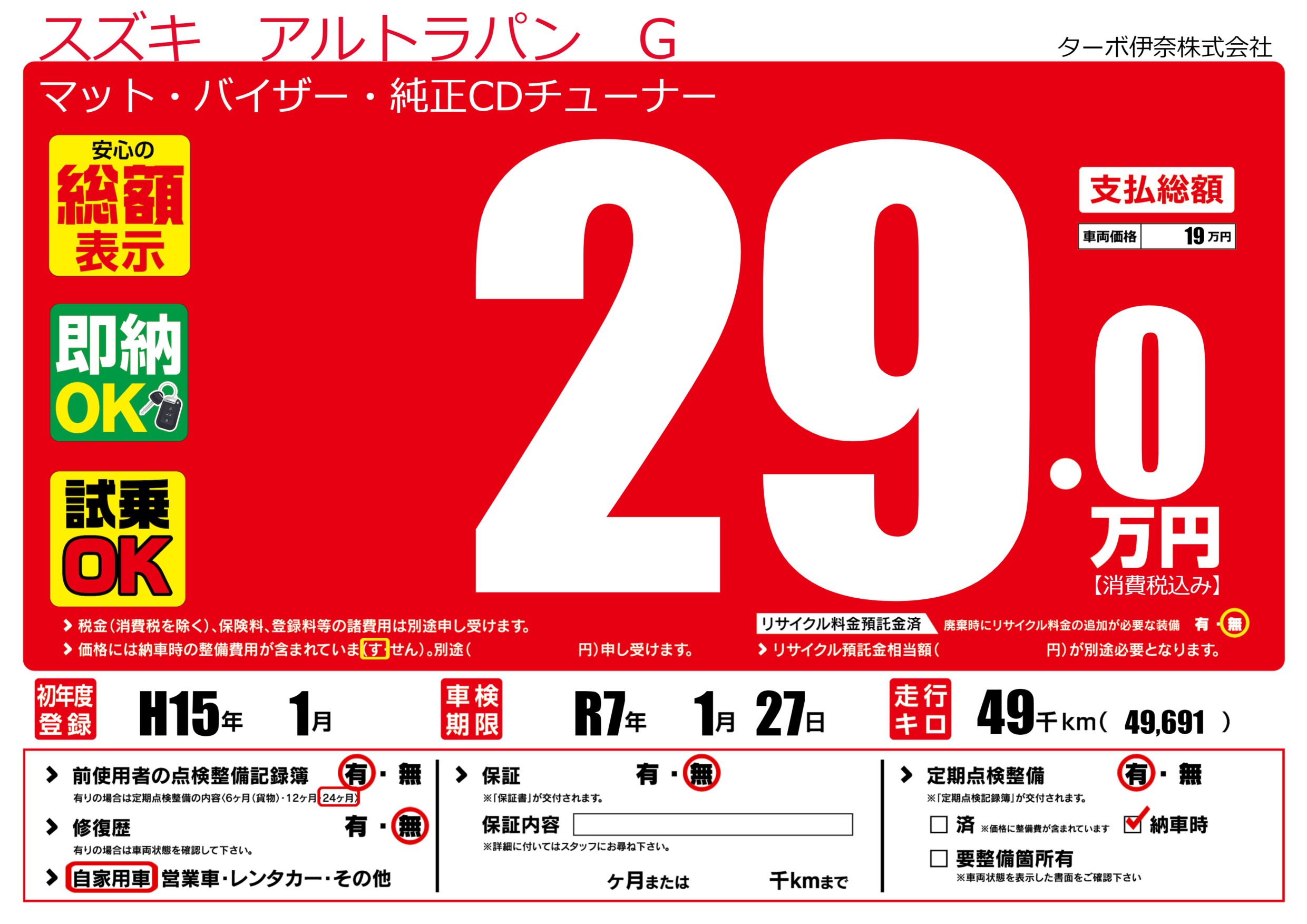 | 走行キロ | 4.9万km | 初年度登録 | H15年1月 |
