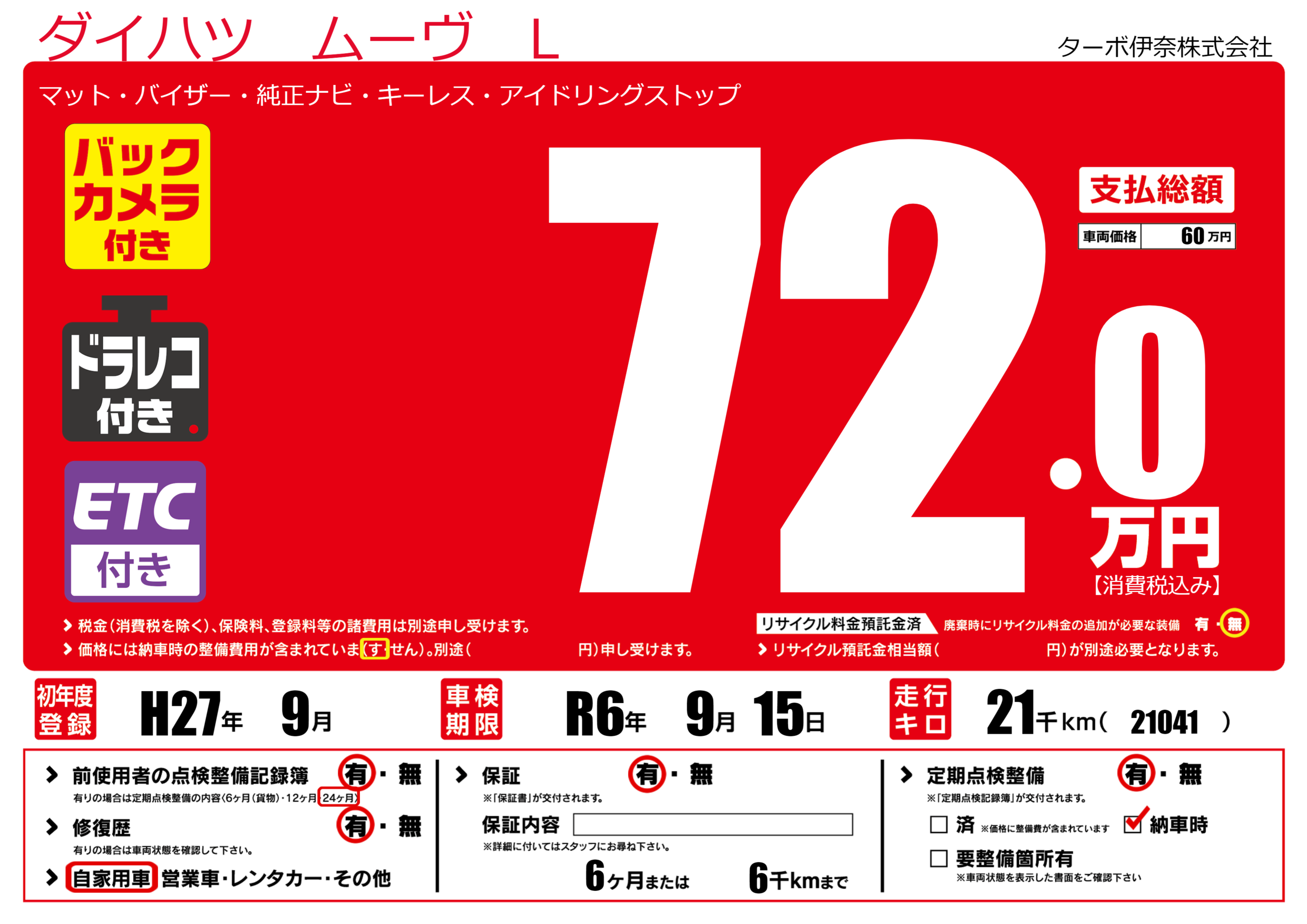| 車名 | ダイハツ ムーヴ L | グレード ミッション 排気量 |