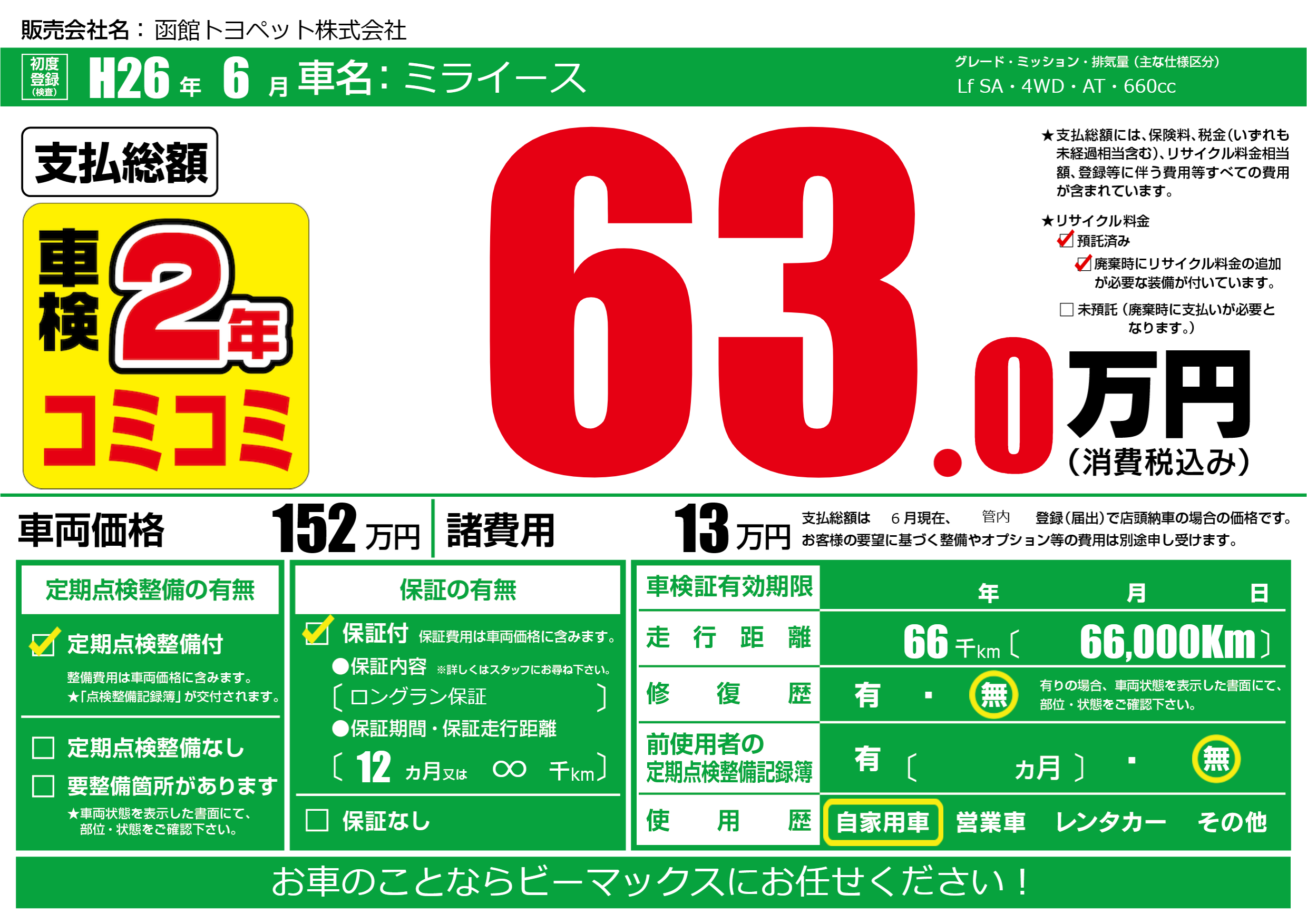 | 走行キロ | 6.6万km | 初年度登録 | H26年6月 |