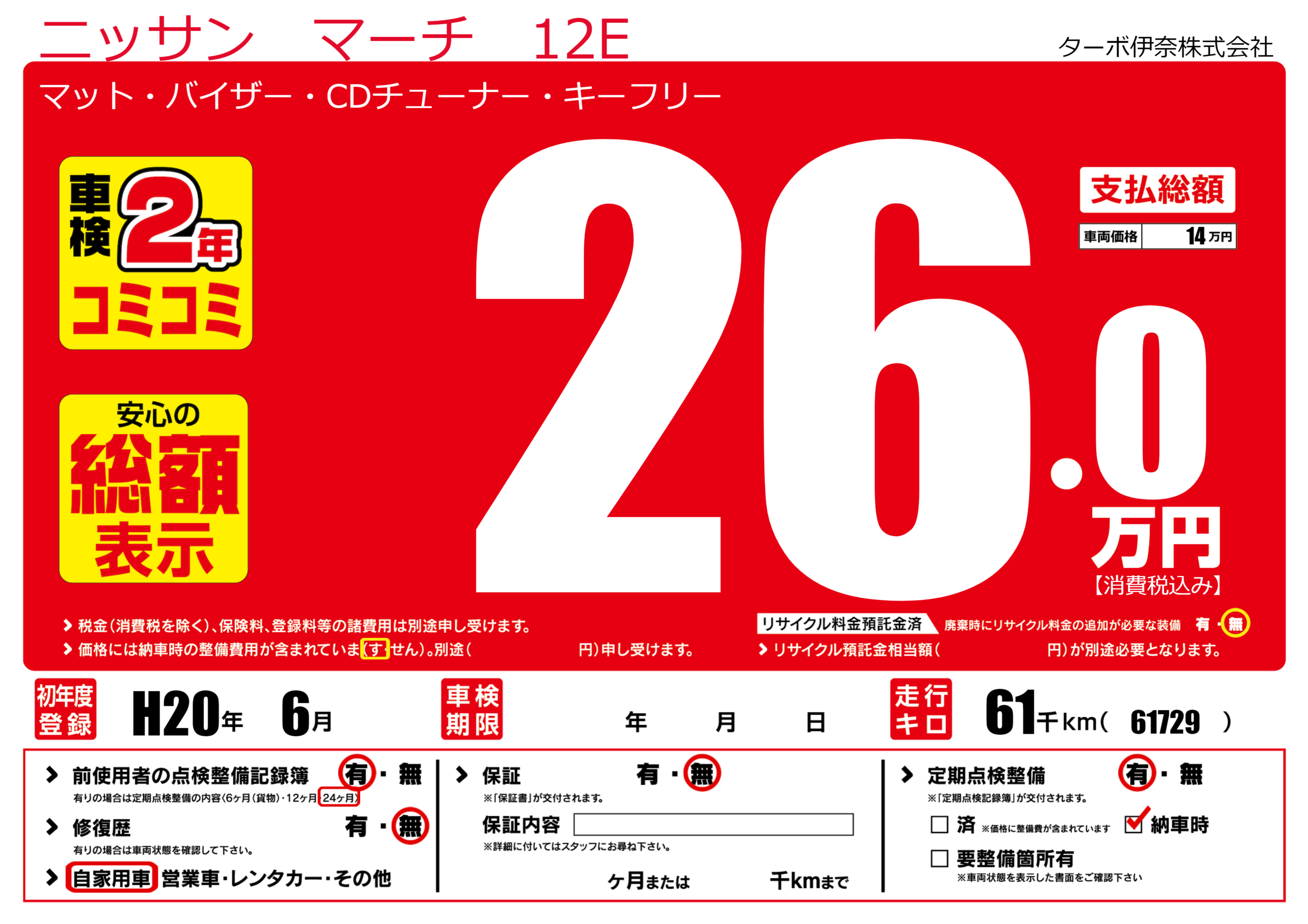 | 車名 | ニッサン マーチ 12E | グレード ミッション 排気量 |