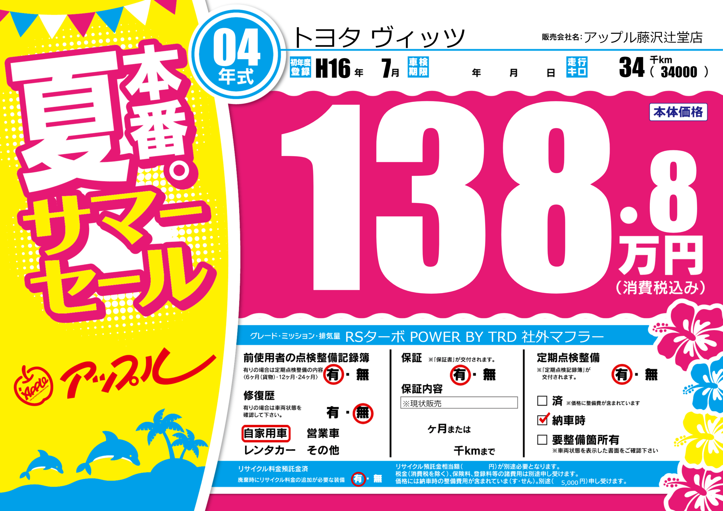 | 走行キロ | 3.4万km | 初年度登録 | H16年7月 |