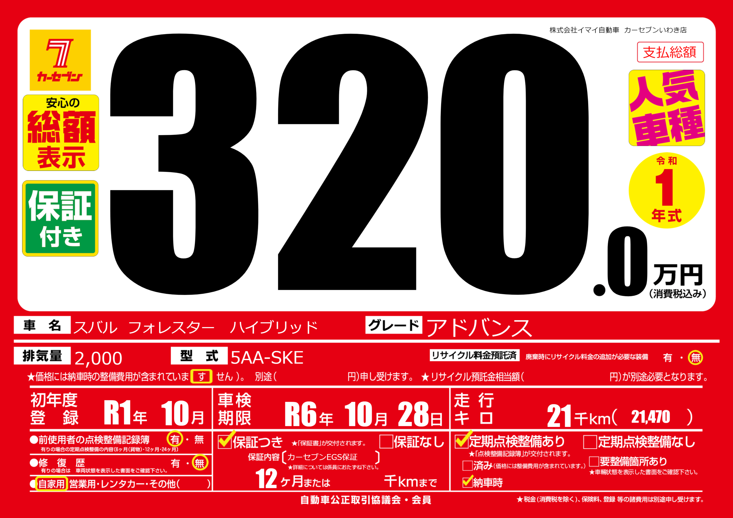 | 車名 | スバル フォレスター ハイブリッド | グレード ミッション 排気量 |