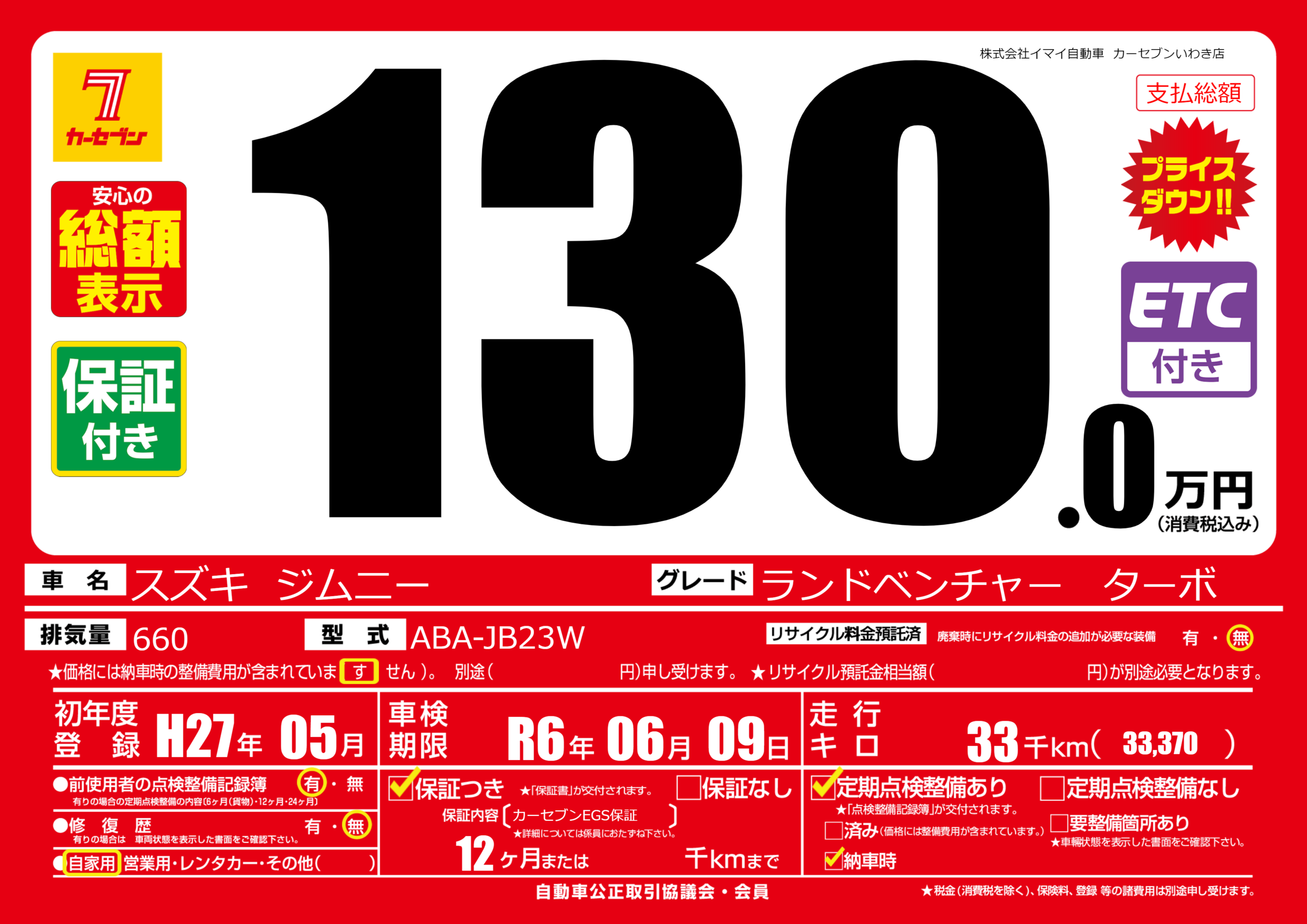 | 走行キロ | 3.3万km | 初年度登録 | H27年05月 |