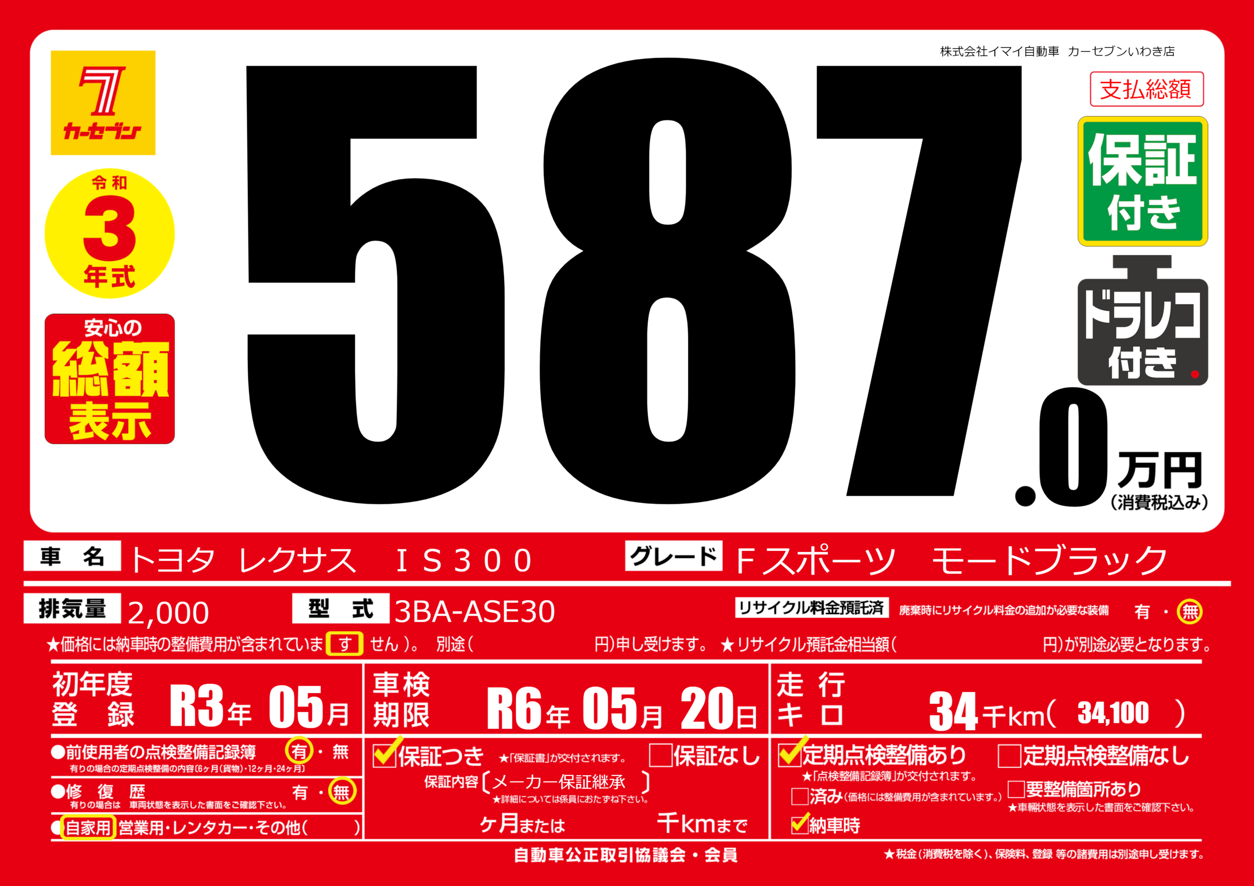 | 車名 | トヨタ レクサス IS300 | グレード ミッション 排気量 |