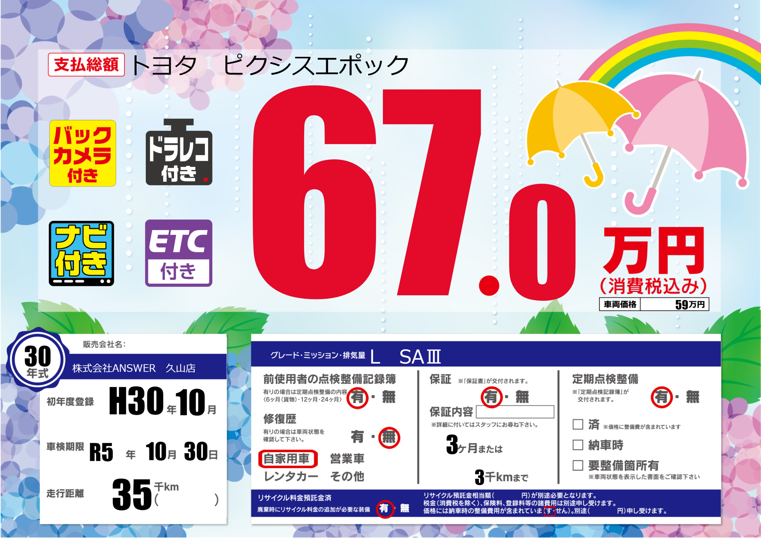 | 車名 | トヨタ ピクシスエポック | グレード ミッション 排気量 |