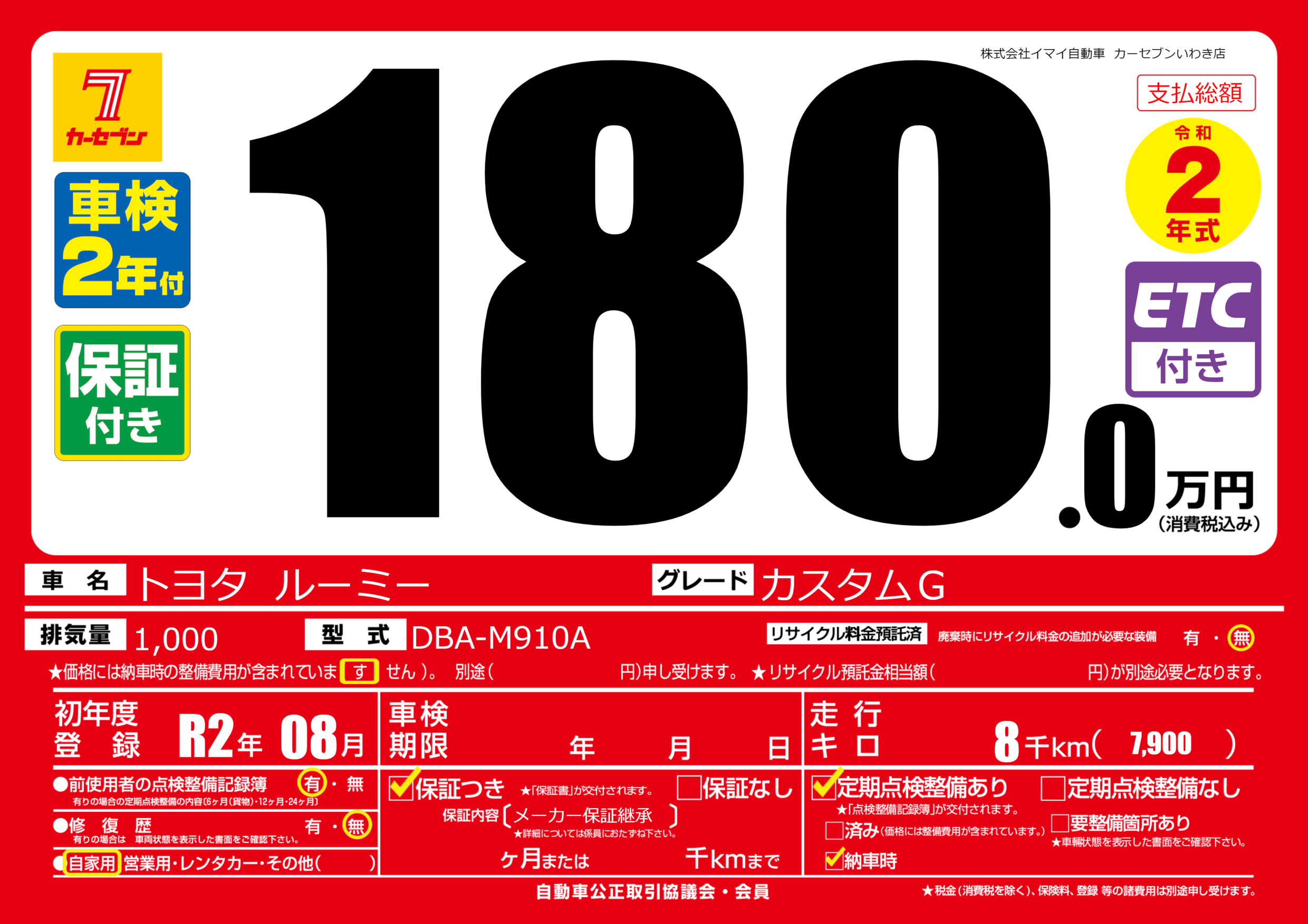 | 車名 | トヨタ ルーミー | グレード ミッション 排気量 |