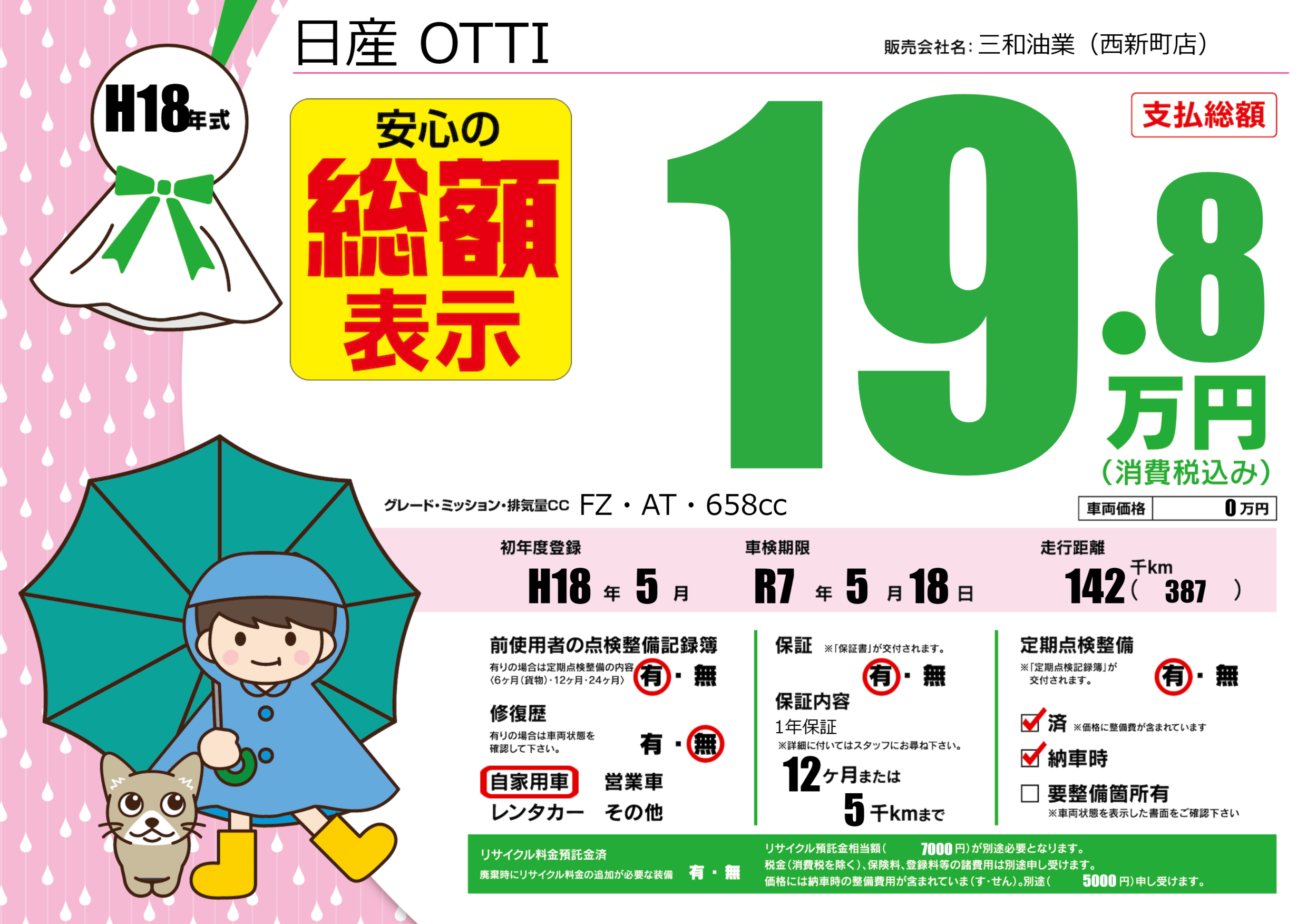 | 車名 | 日産 OTTI | グレード ミッション 排気量 |