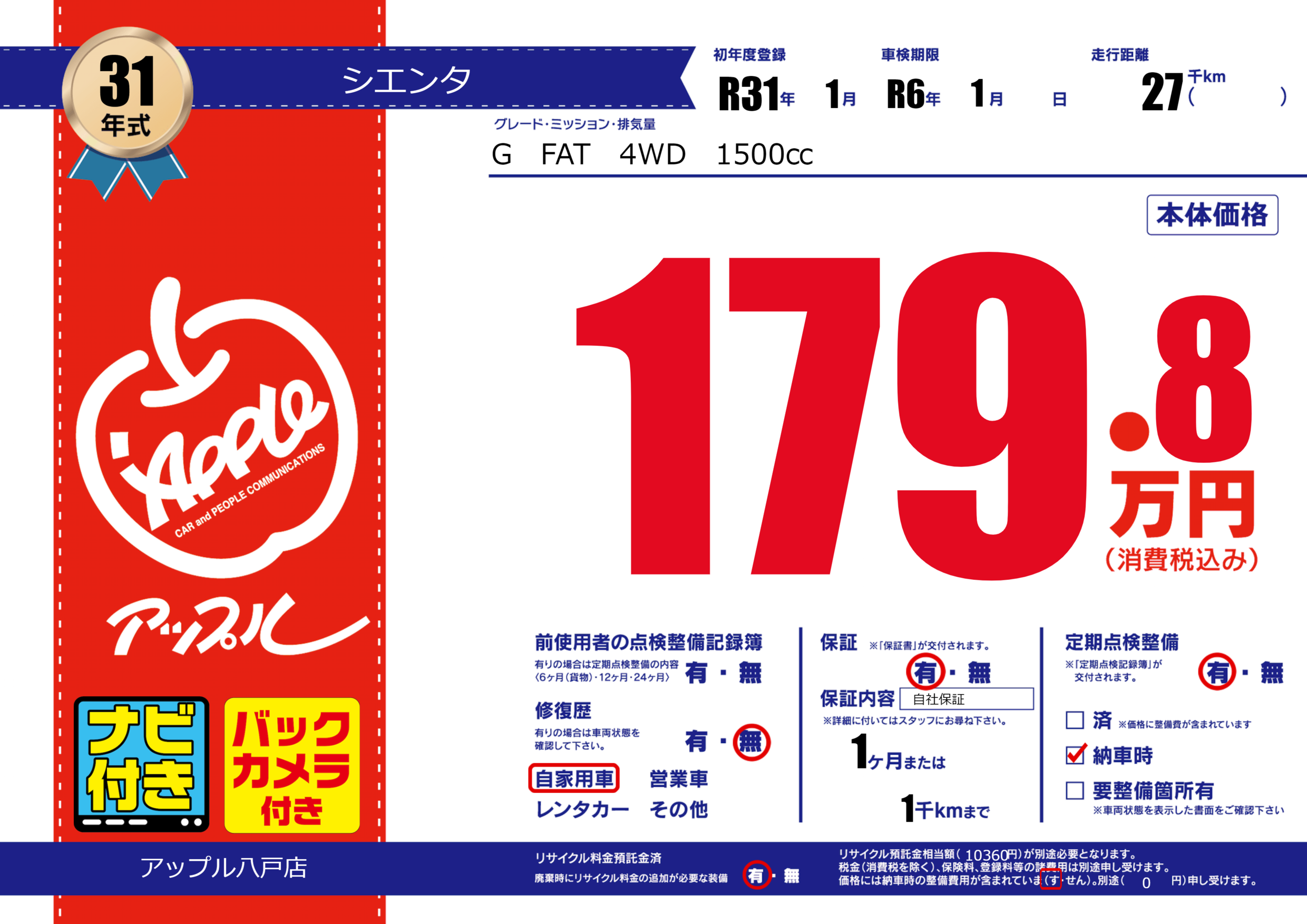 保証付き 保証内容( 自社保証) 1ヶ月または(1)千kmまで |