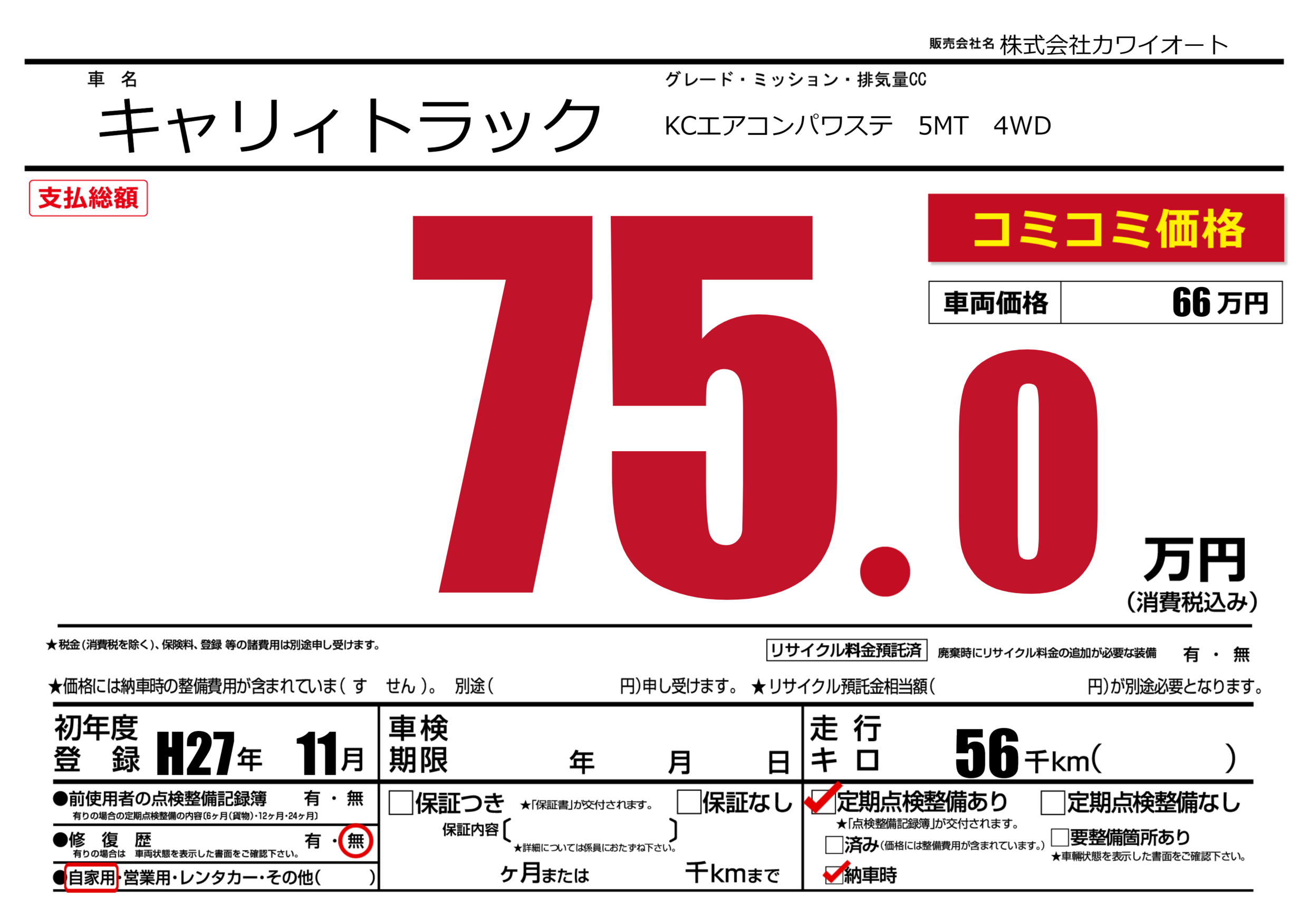 | 車名 | キャリィトラック | グレード ミッション 排気量 |