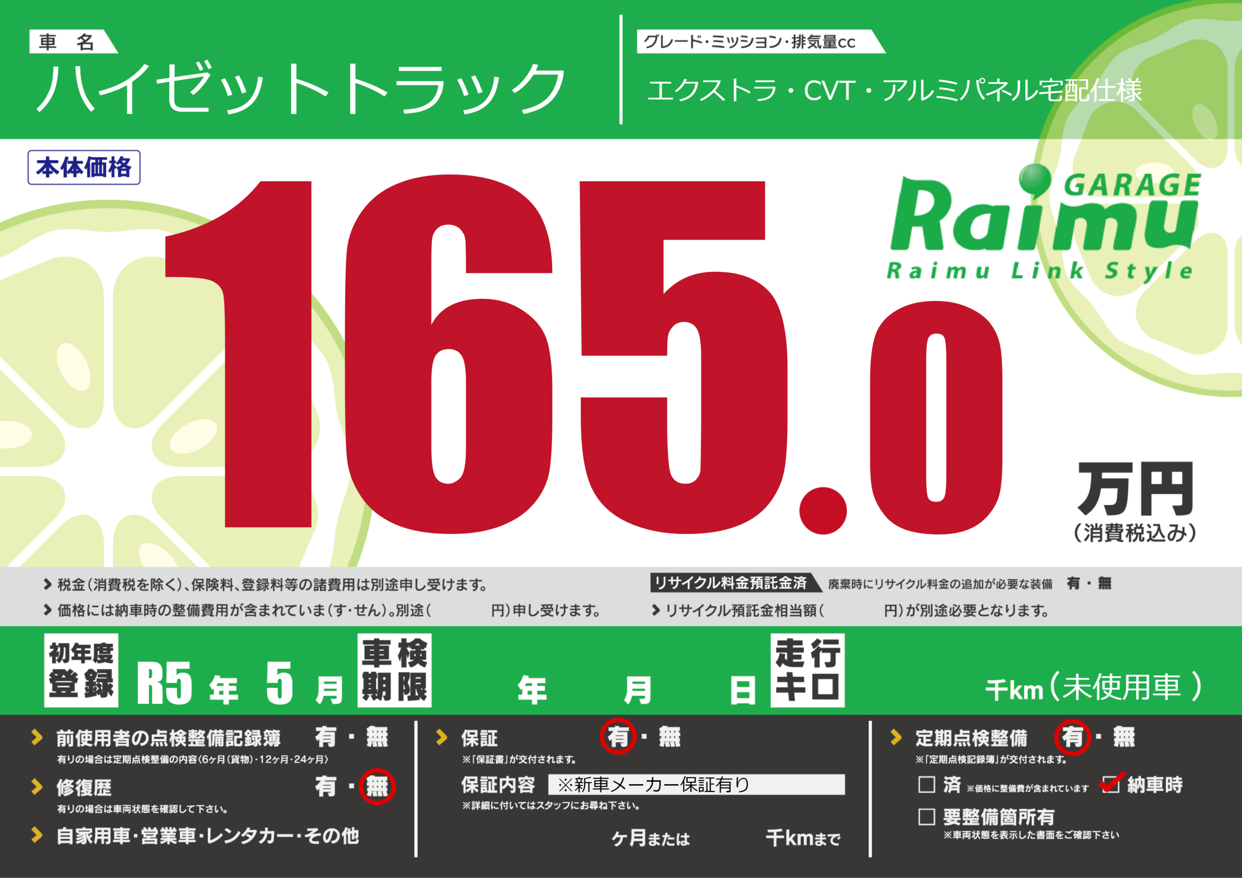 | 車名 | ハイゼットトラック | グレード ミッション 排気量 |
