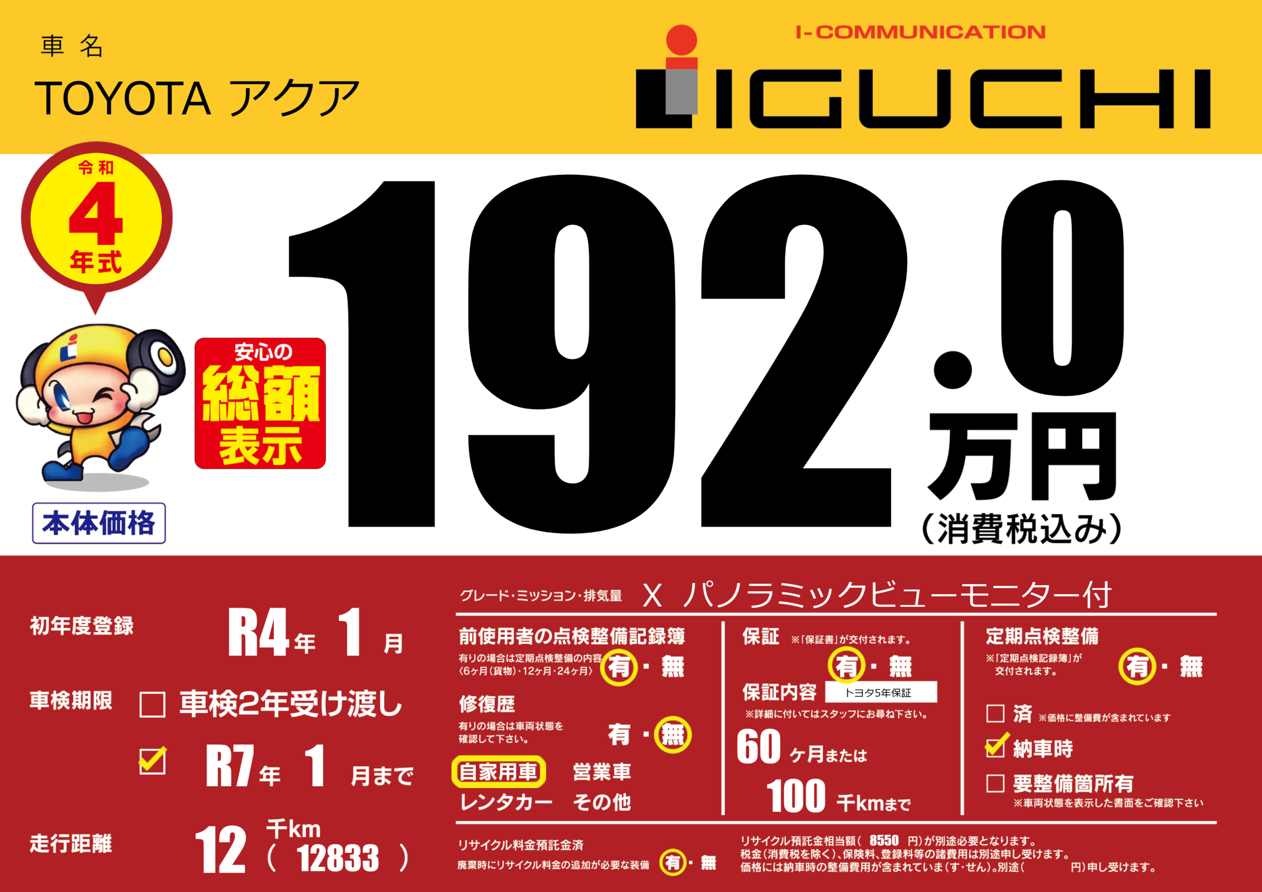 保証付き 保証内容(トヨタ5年保証) 60ヶ月または(100)千kmまで |