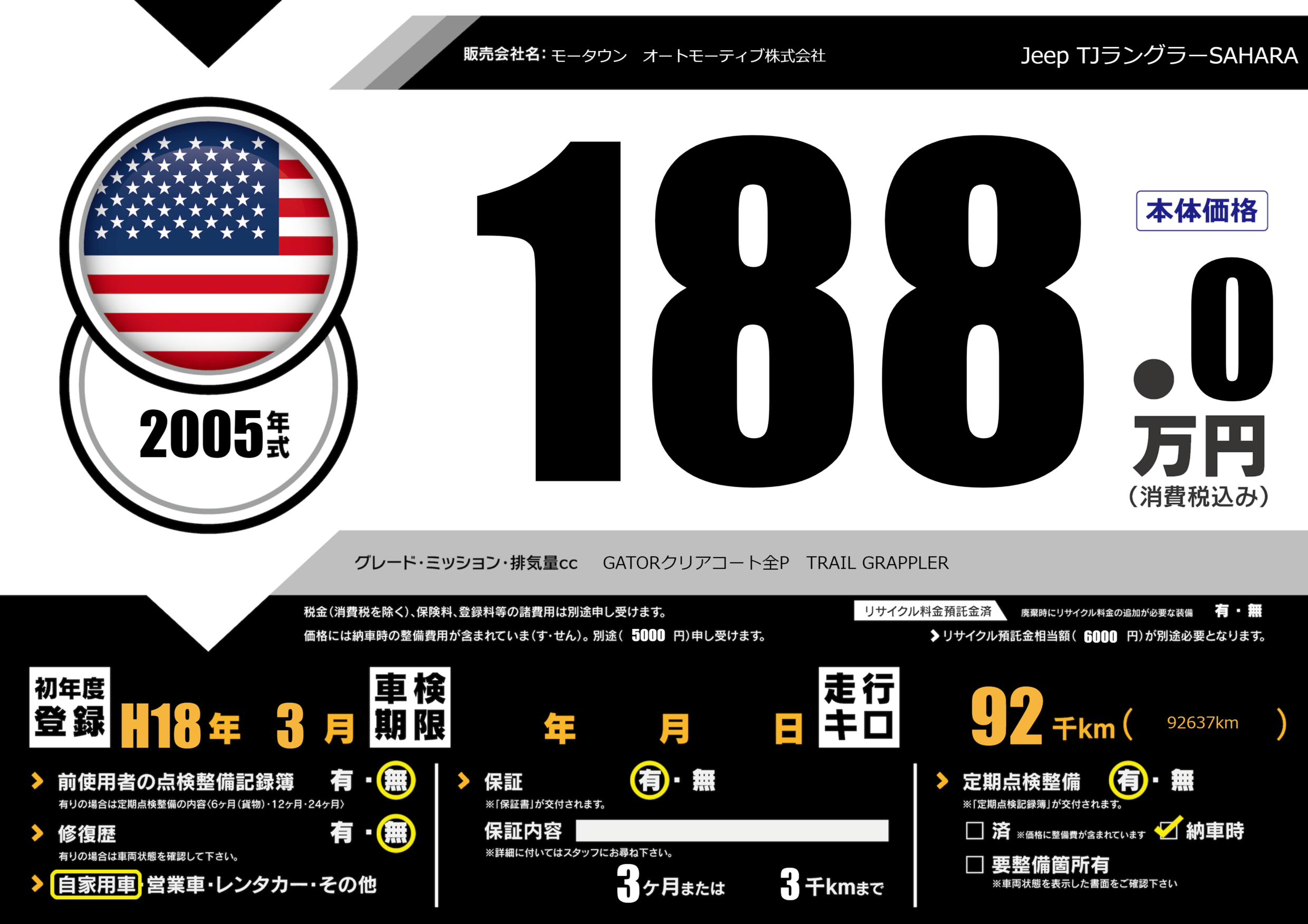 | 車名 | Jeep TJラングラーSAHARA | グレード ミッション 排気量 |