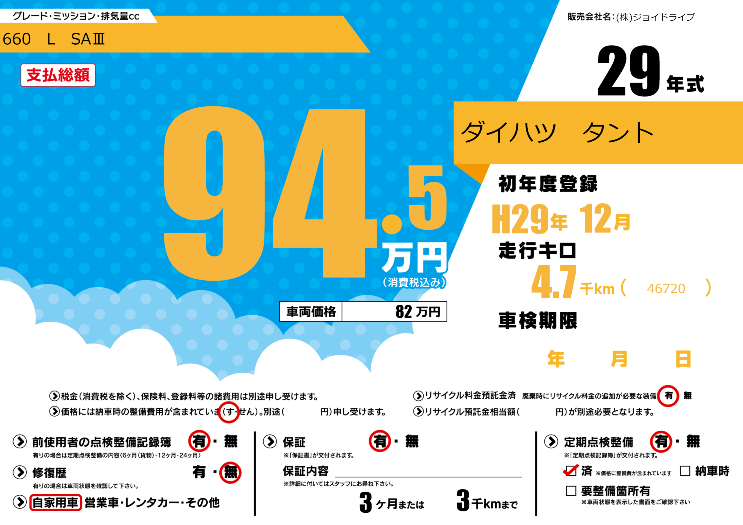 | 定期点検整備 | 定期点検整備あり 定期点検整備済み | ||