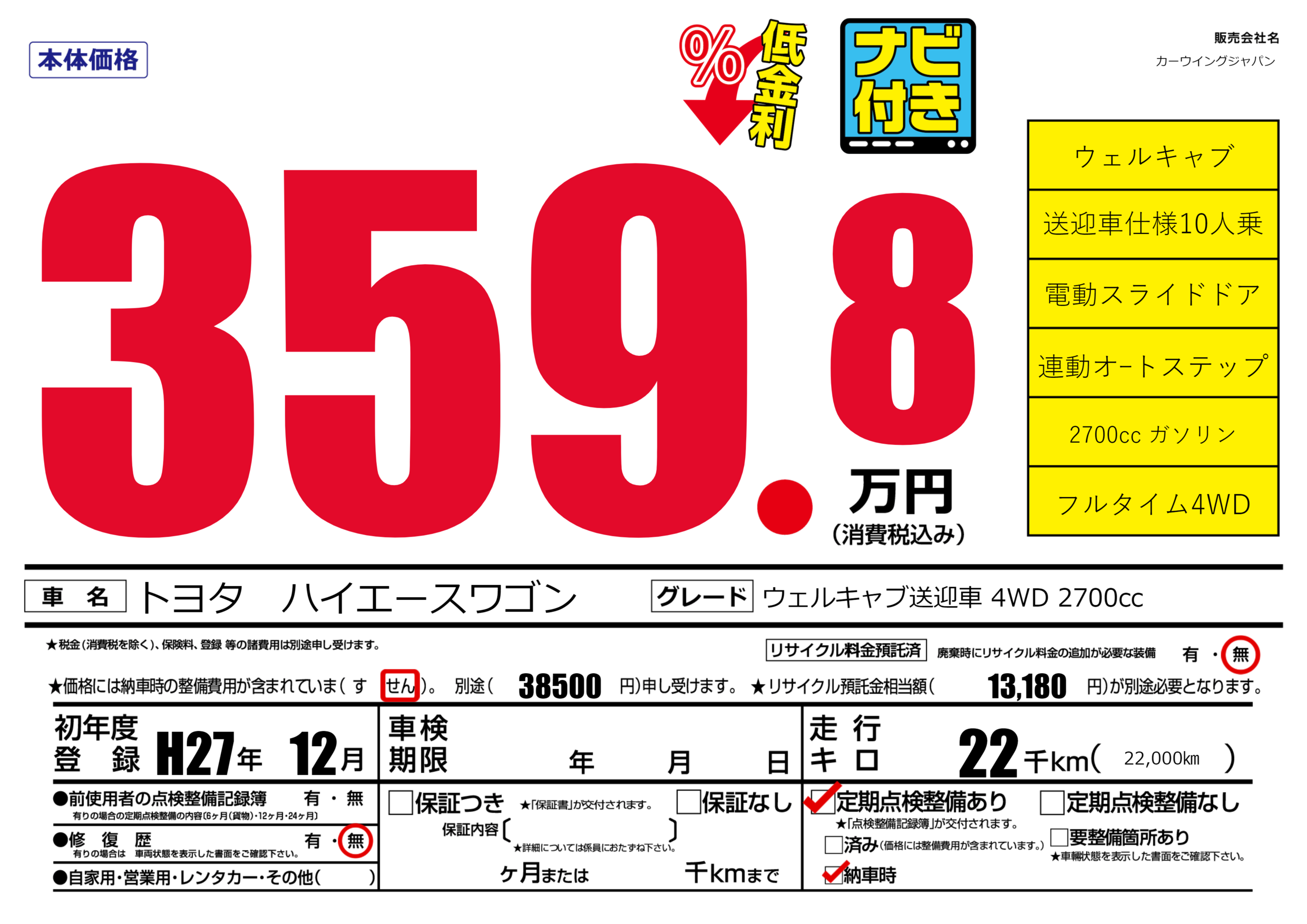 | 定期点検整備 | 定期点検整備あり 納車時あり | ||