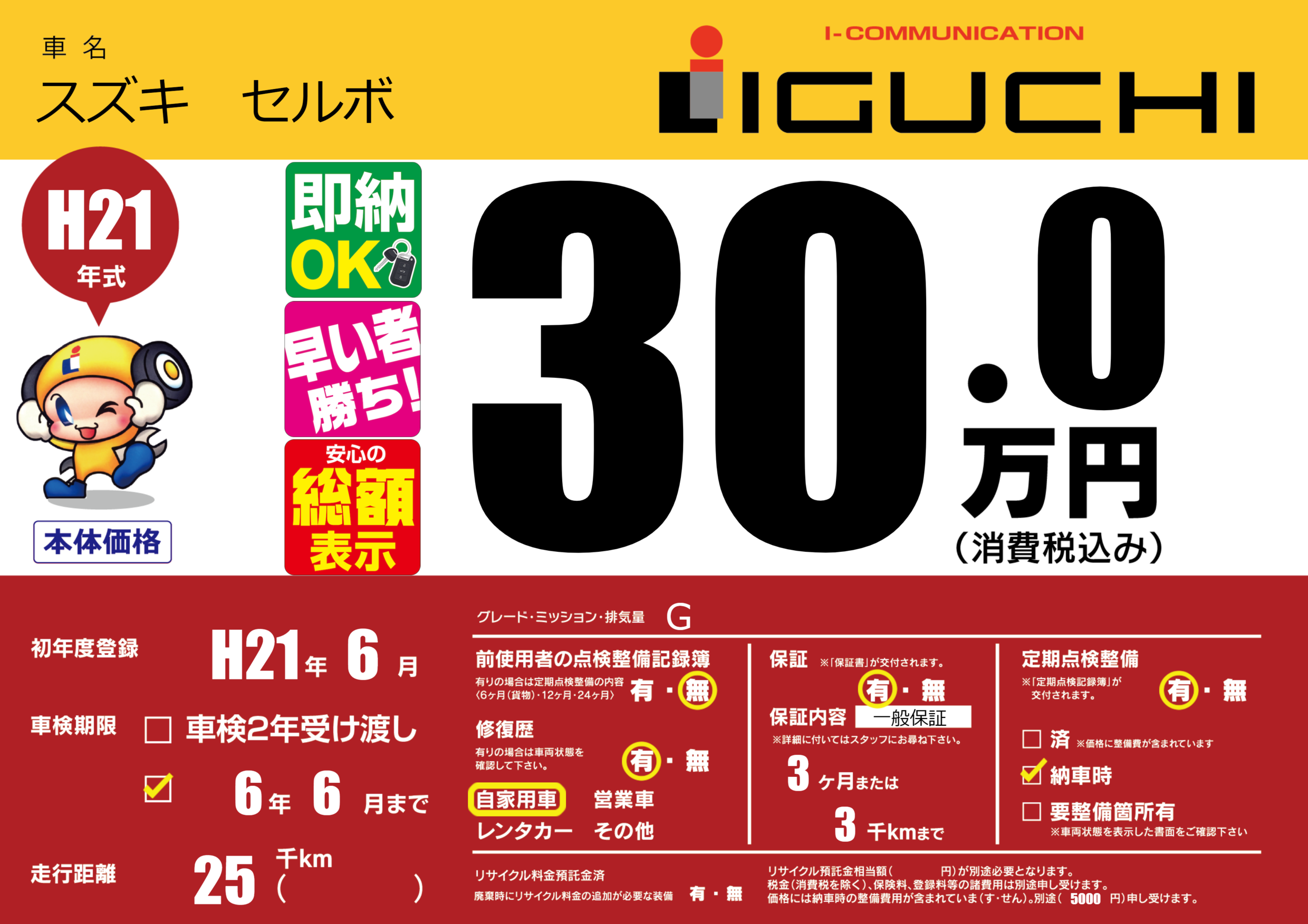 保証付き 保証内容(一般保証) 3ヶ月または(3)千kmまで |